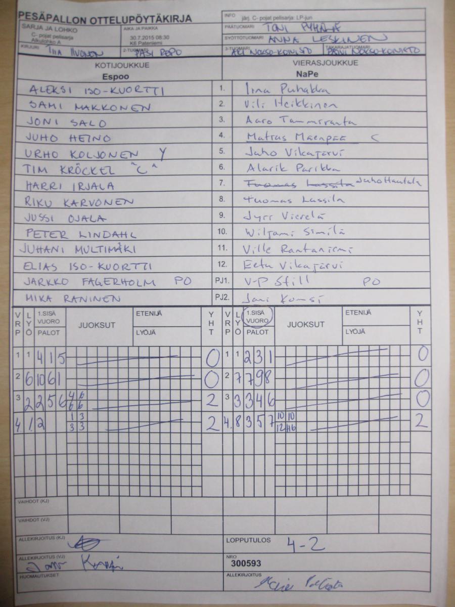 | C- pojat pelisarja - Alkulohko A | 26.7.2015 14:45 | K9 Meritoppila | NaPe | PäPe C | Espoo |