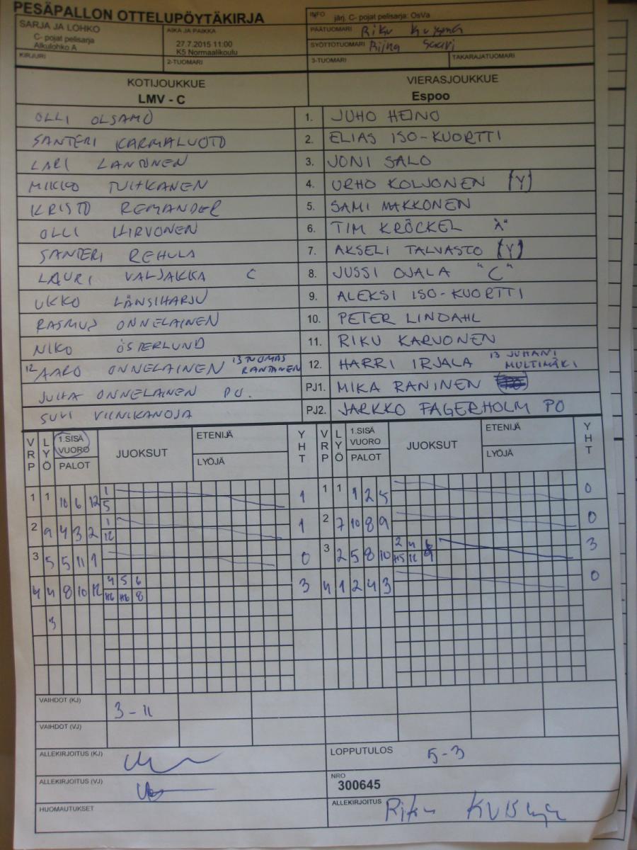 | 27.7.2015 11:00 | K5 Normaalikoulu | LMV - C | Espoo | 5-3 | näytä |