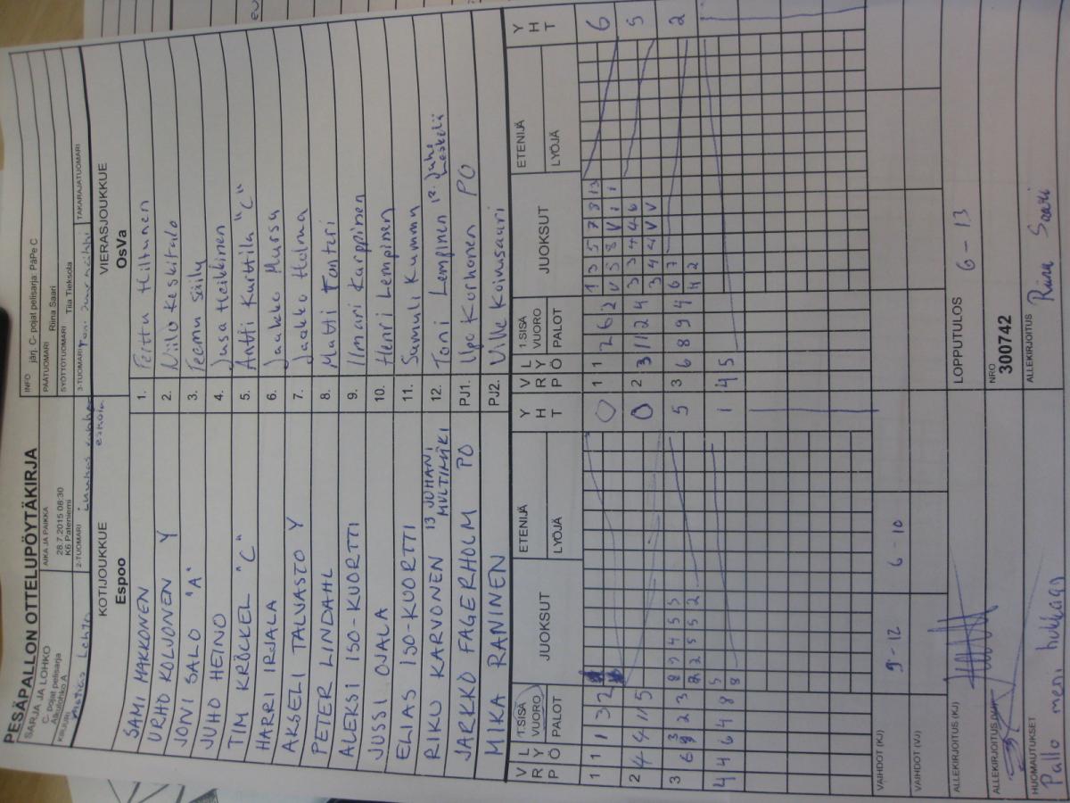 | C- pojat pelisarja - Alkulohko A | 29.7.2015 13:00 | K6 Pateniemi | OsVa | LMV - C | Espoo |
