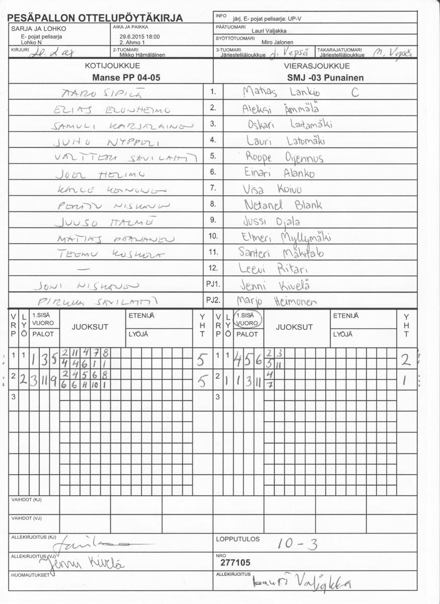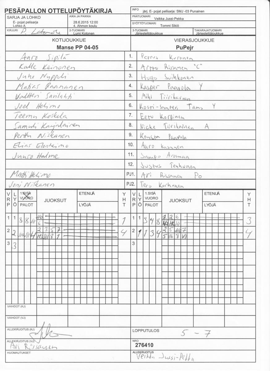 | E- pojat pelisarja - Lohko A | 29.6.2015 13:00 | 2. Ahmo 1 | PuPejr | KPL 04 | Manse PP 04-05 |