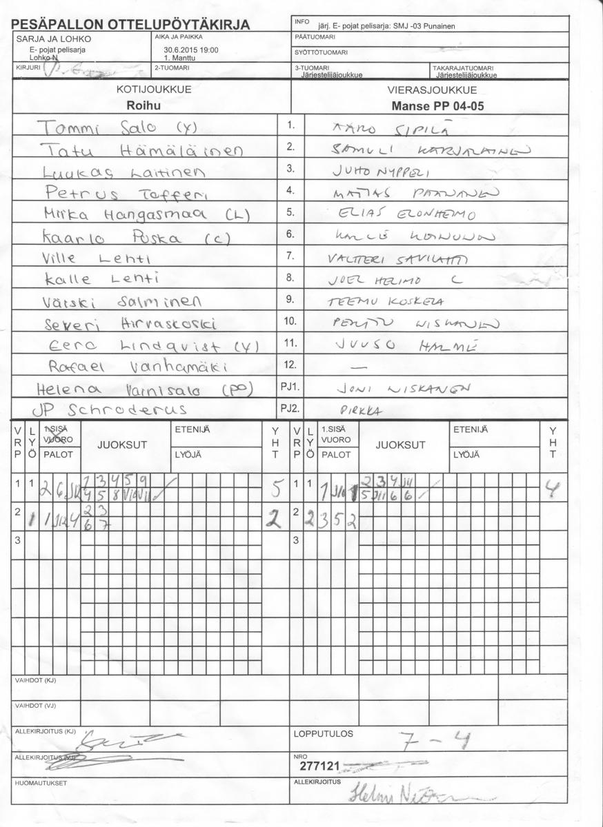 | Lohko N | 29.6.2015 19:00 | 2. Ahmo 1 | Roihu | UP-V | Manse PP 04-05 |