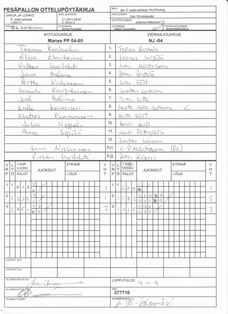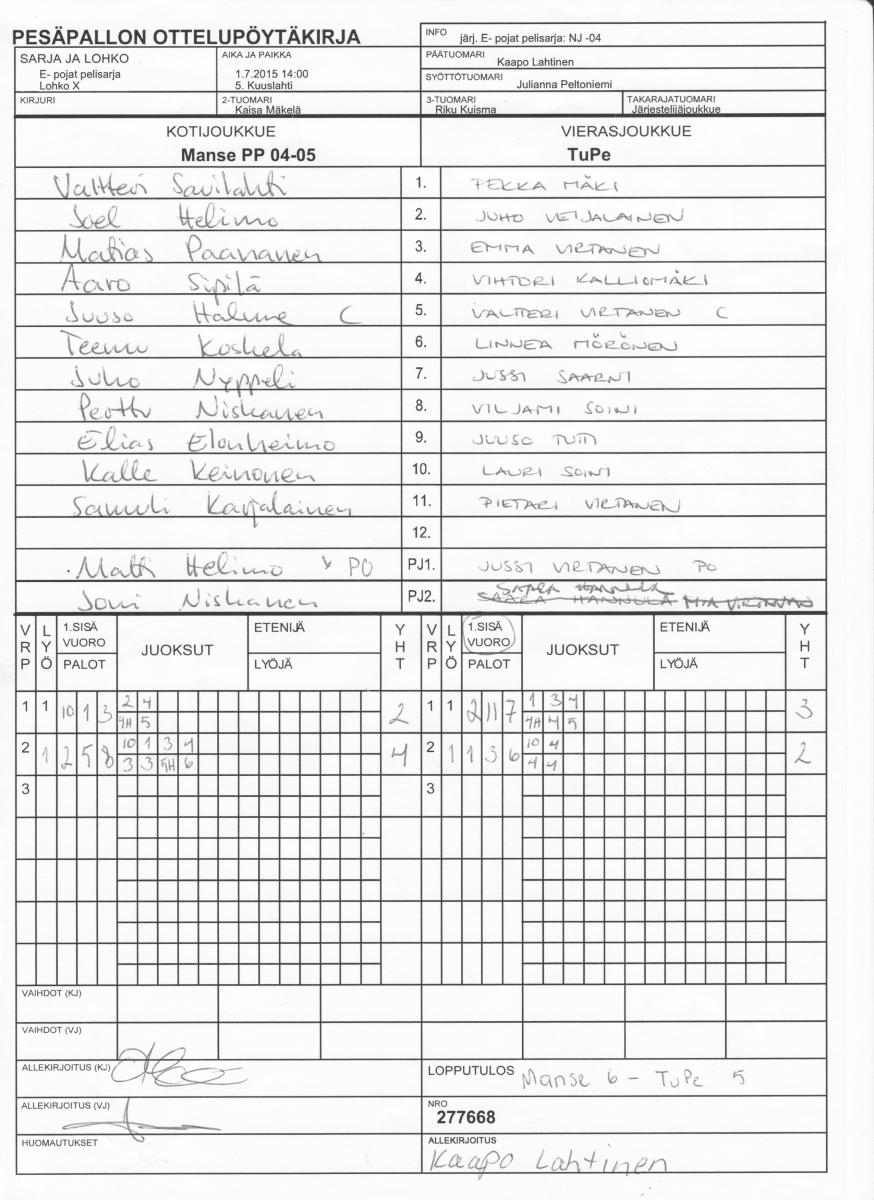 | E- pojat pelisarja - Lohko A | 28.6.2015 13:00 | 4. Ahmon koulu | SMJ -03 Punainen | KPL 04 | Manse PP 04-05 |