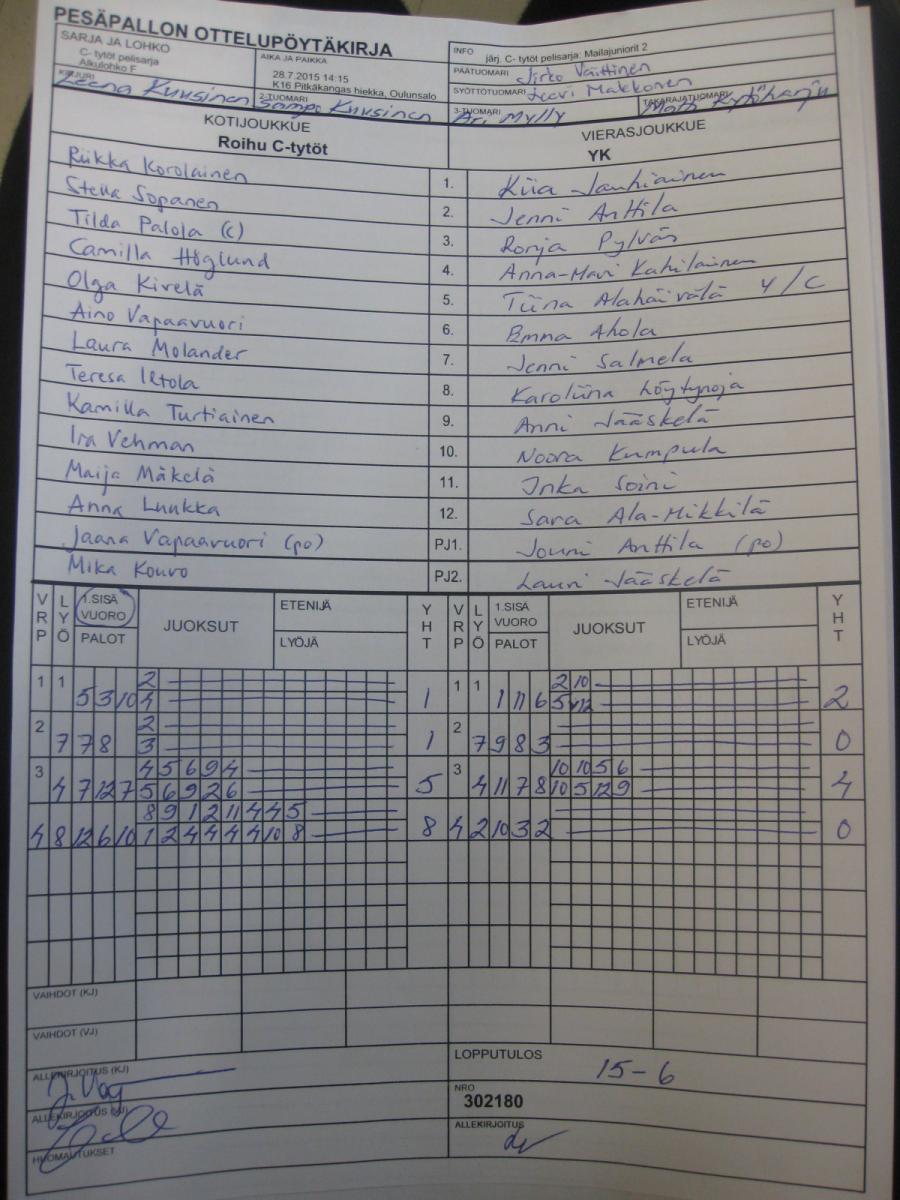 | Jatkolohko K (sijat 13-24) | 29.7.2015 13:00 | K17 Ritaharju | LP -Juniorit | OuHu | Roihu C-tytöt |
