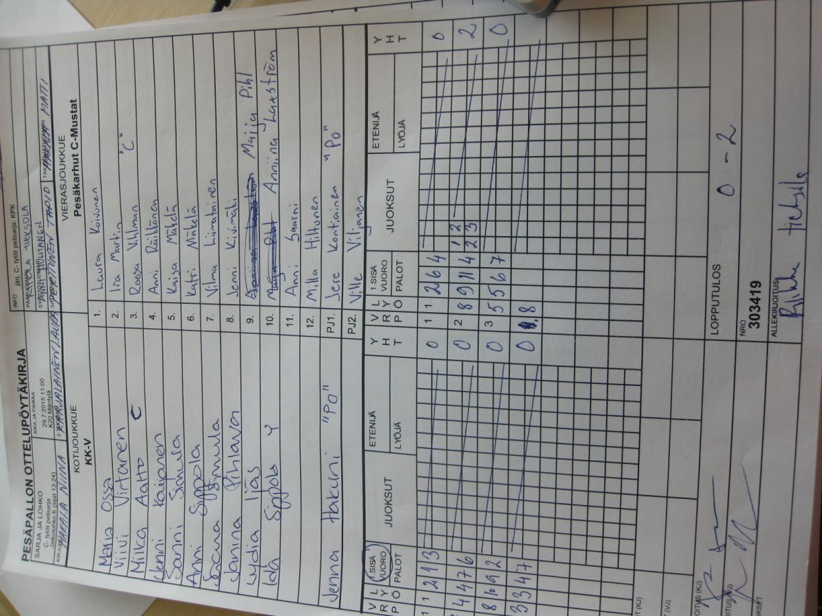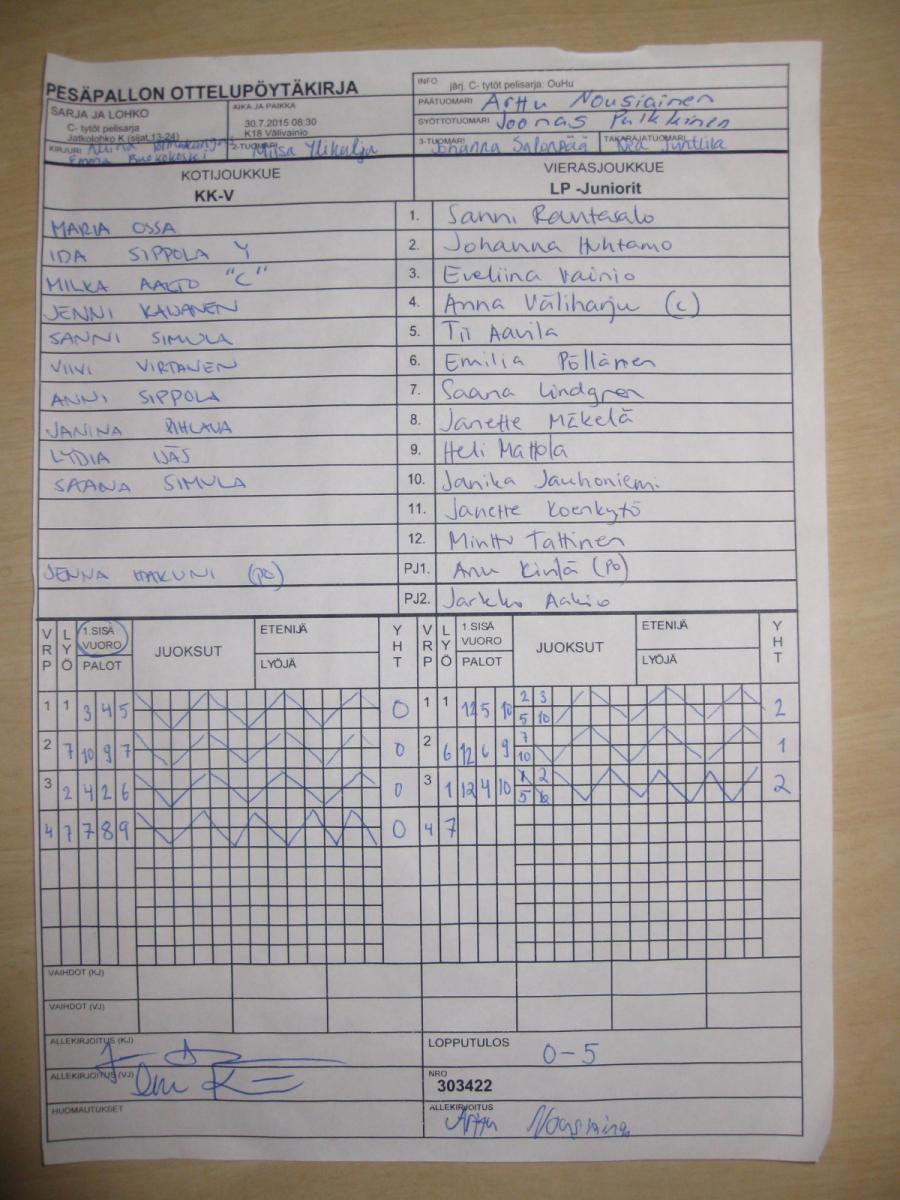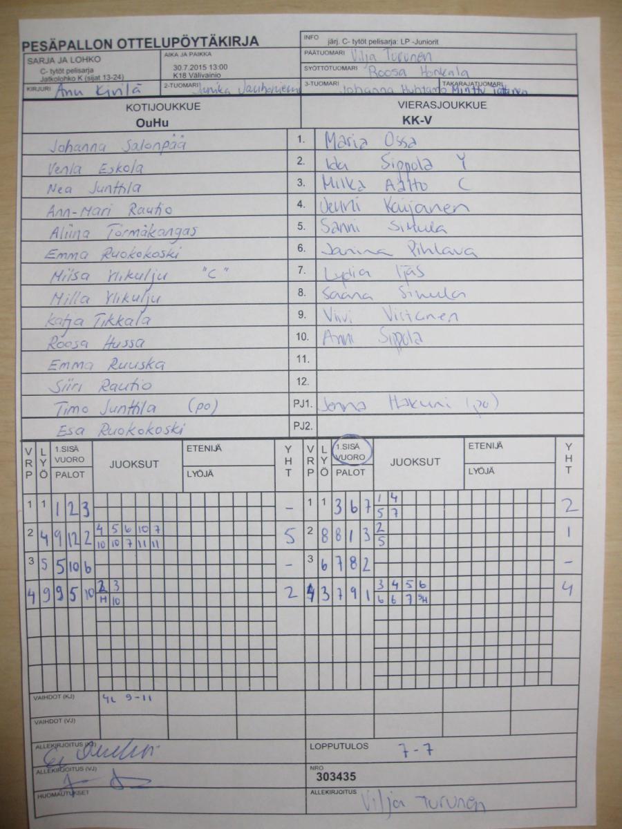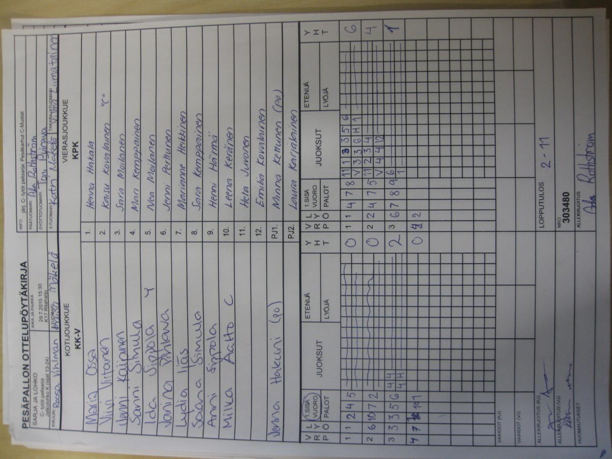 | Jatkolohko K (sijat 13-24) | 30.7.2015 09:45 | K18 Välivainio | OuHu | Roihu C-tytöt | KK-V |