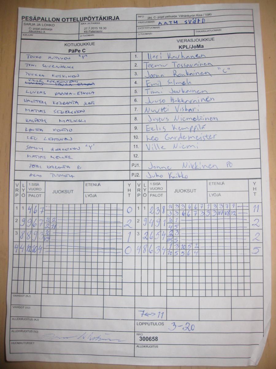 | 27.7.2015 18:30 | K6 Pateniemi | PäPe C | KPL/JoMa | 3-20 | näytä |