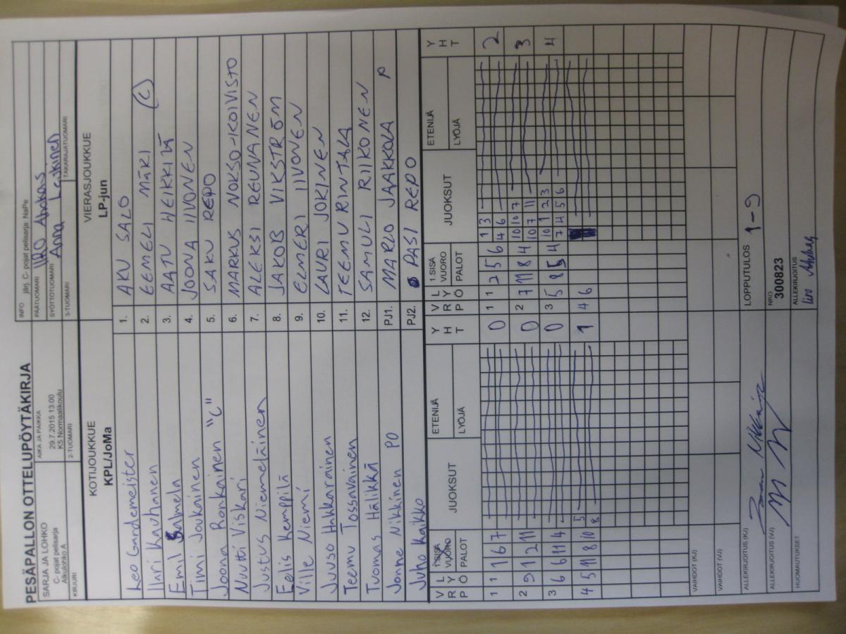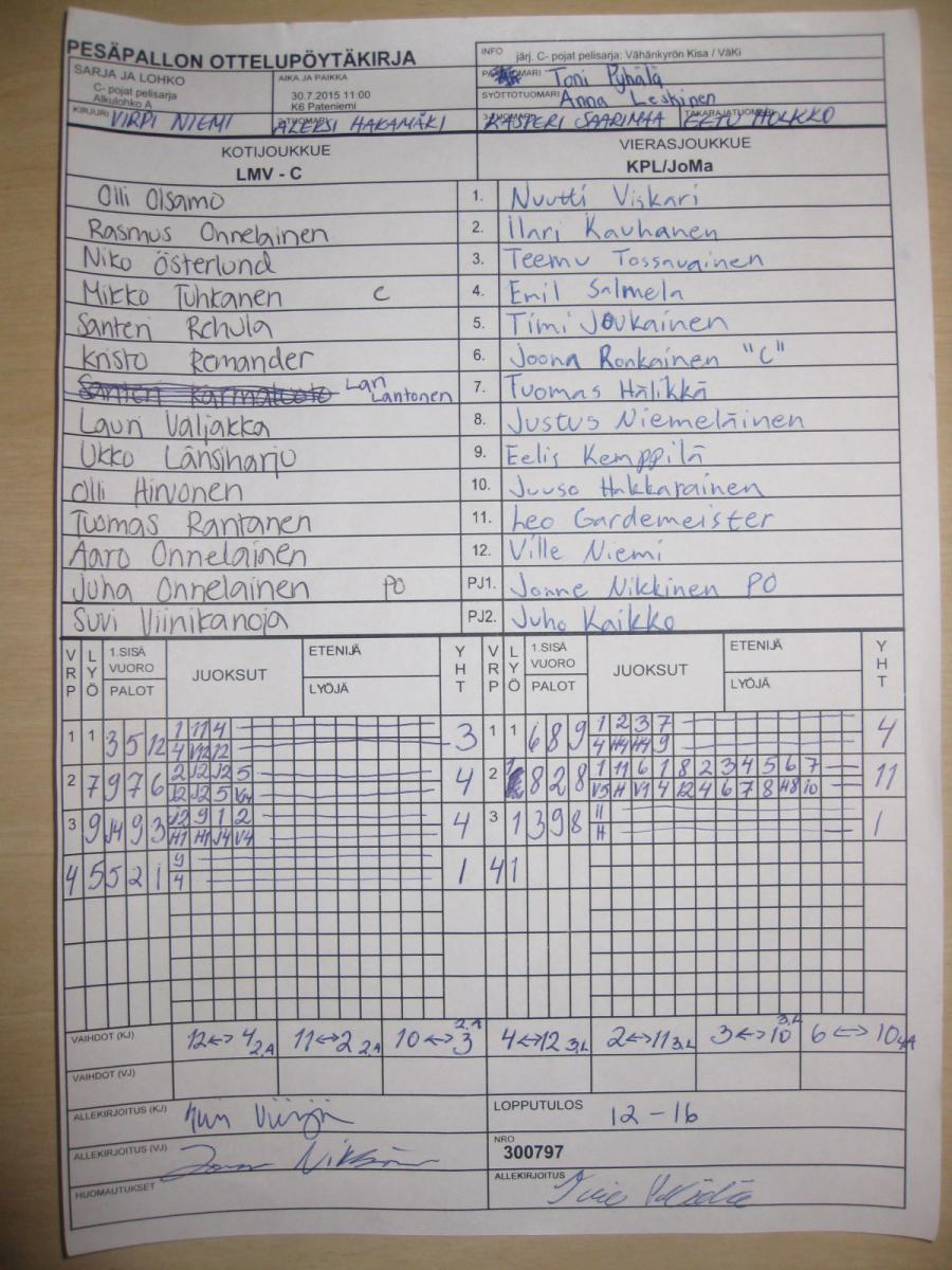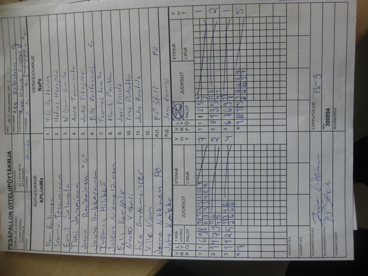 | C- pojat pelisarja - Alkulohko A | 28.7.2015 18:30 | K3 Niittyaro 2 | LMV - C | HP/Ysit | KPL/JoMa |