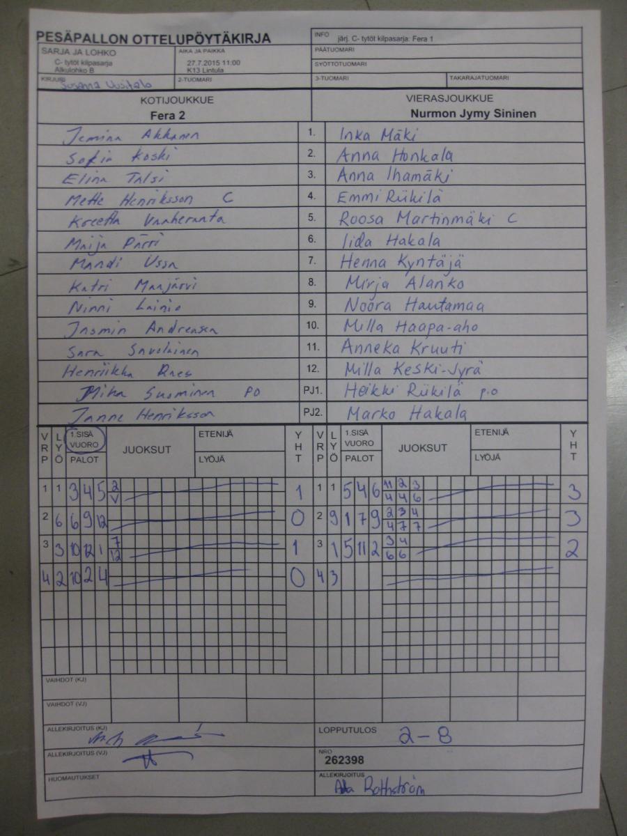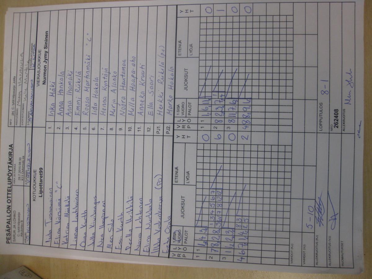 | Jatkolohko H (9-16) | 29.7.2015 13:00 | K13 Lintula | Tahko1 | ViVe 1 | Nurmon Jymy Sininen |