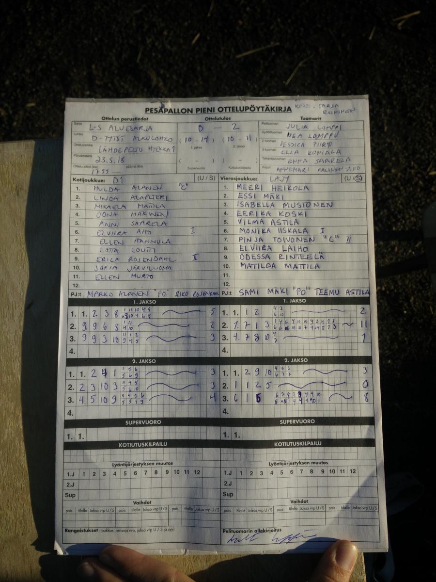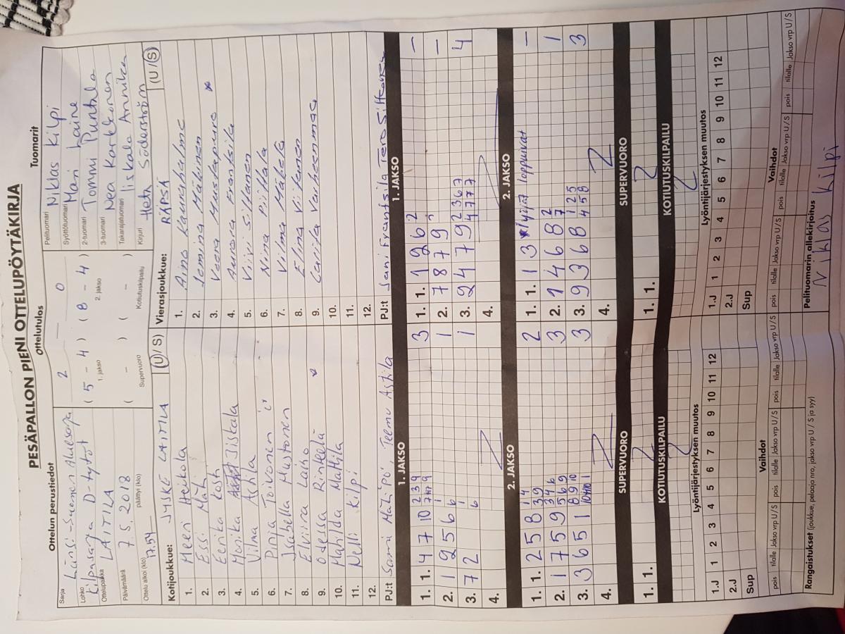 | 31.5.2018 18:00 | Pesäkarhut D-mustat | LaJy | 0-2 (4-25, 3-20) | näytä | |