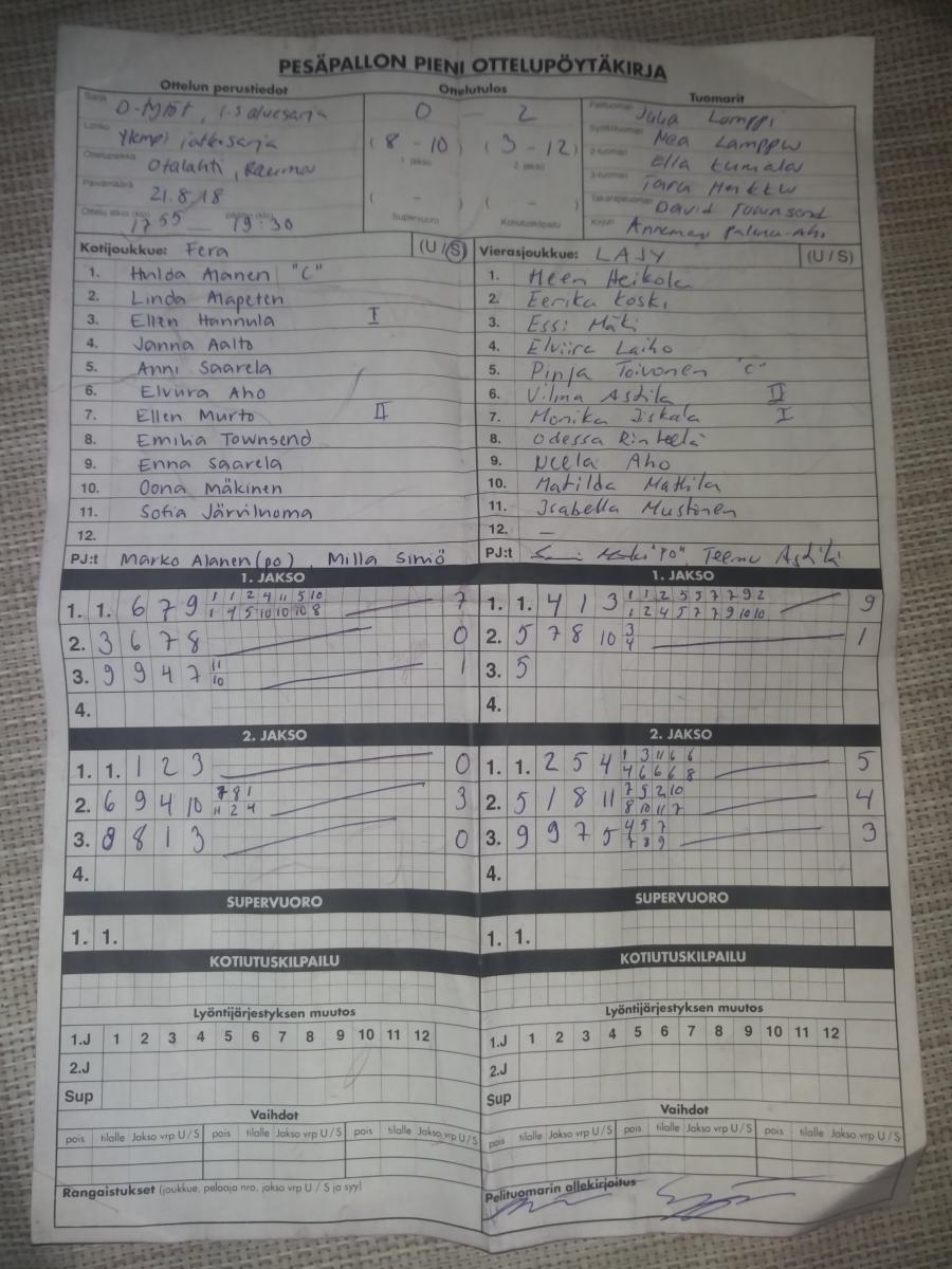 | 21.8.2018 18:00 | Fera D1 | LaJy | 0-2 (8-10, 3-12) | näytä | |