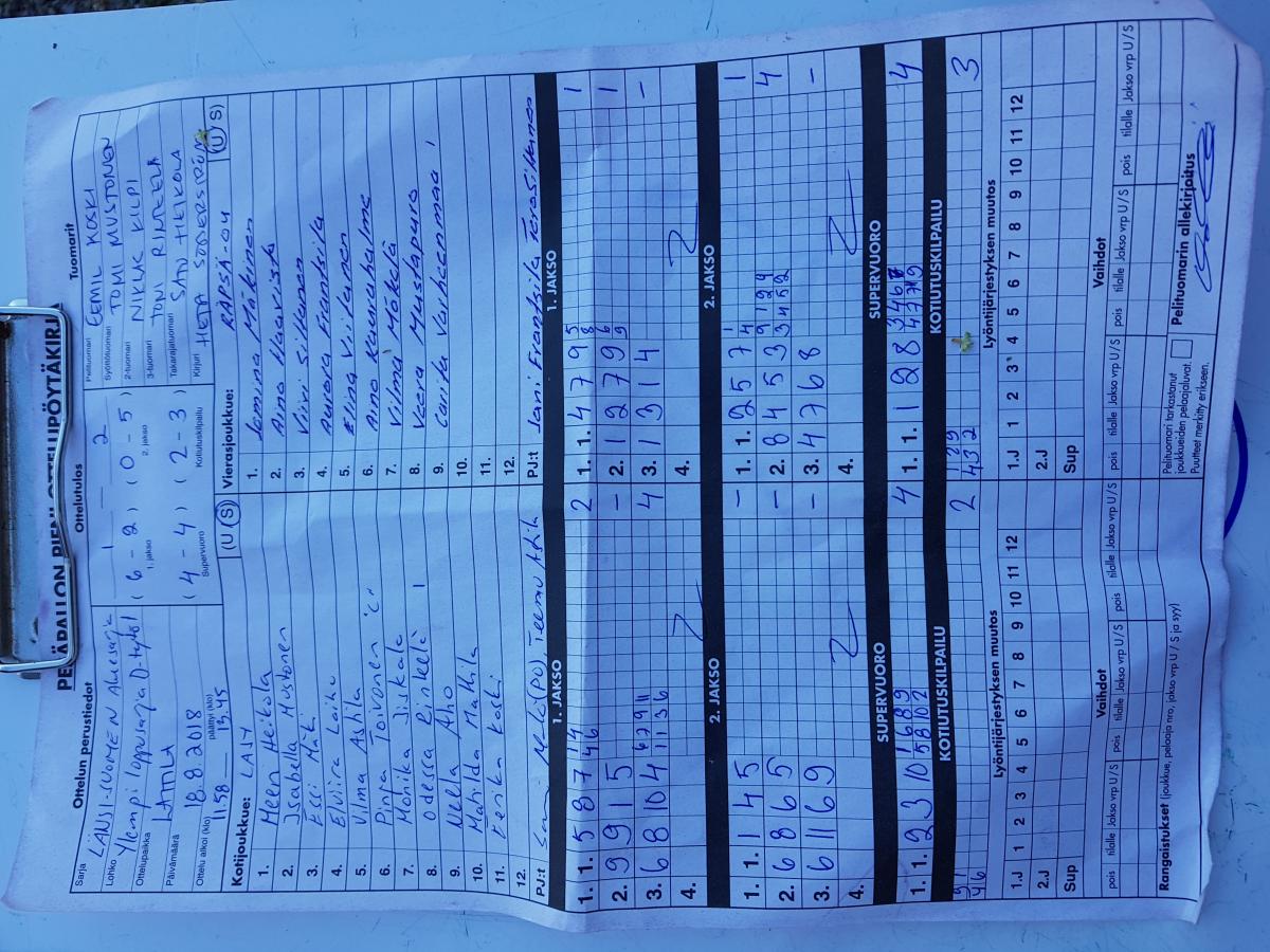 | 14.7.2018 12:00 | Vaasan Maila Sininen | LaJy | 1-2 (17-12, 4-19, 0-2) | näytä | |