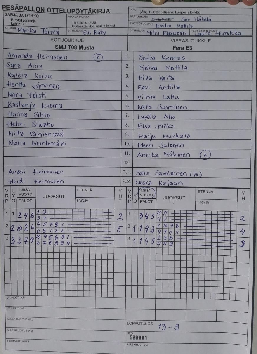| Sijat 18.-20. | 17.6.2018 09:30 | Uudenkoiviston koulun kenttä | NJ E-tytöt | Virkiä sininen | SMJ T08 Musta |