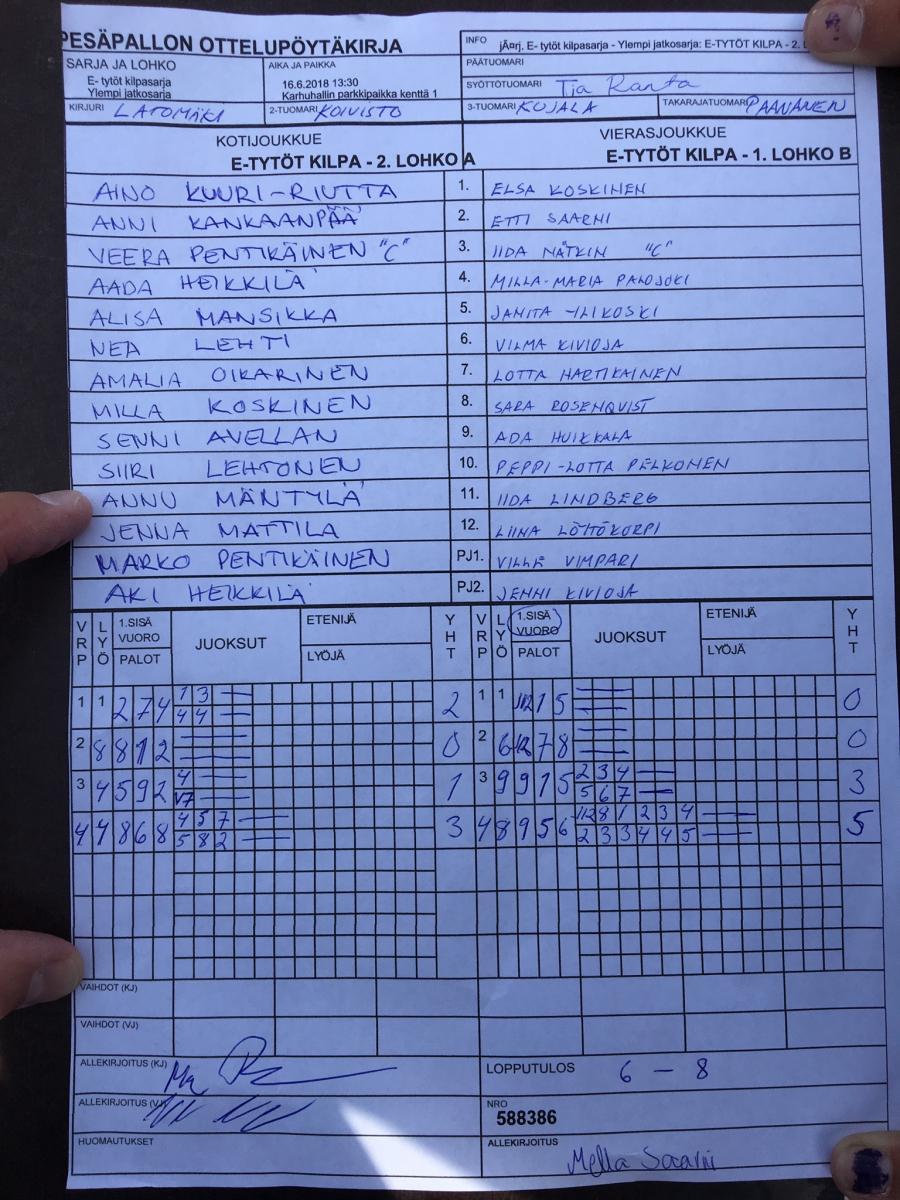 | E- tytöt kilpasarja - Lohko B | 15.6.2018 13:30 | Karhuhallin parkkipaikka kenttä 2 | UP-V E-tytöt | Fera E2 | Pesäkarhut E06 |