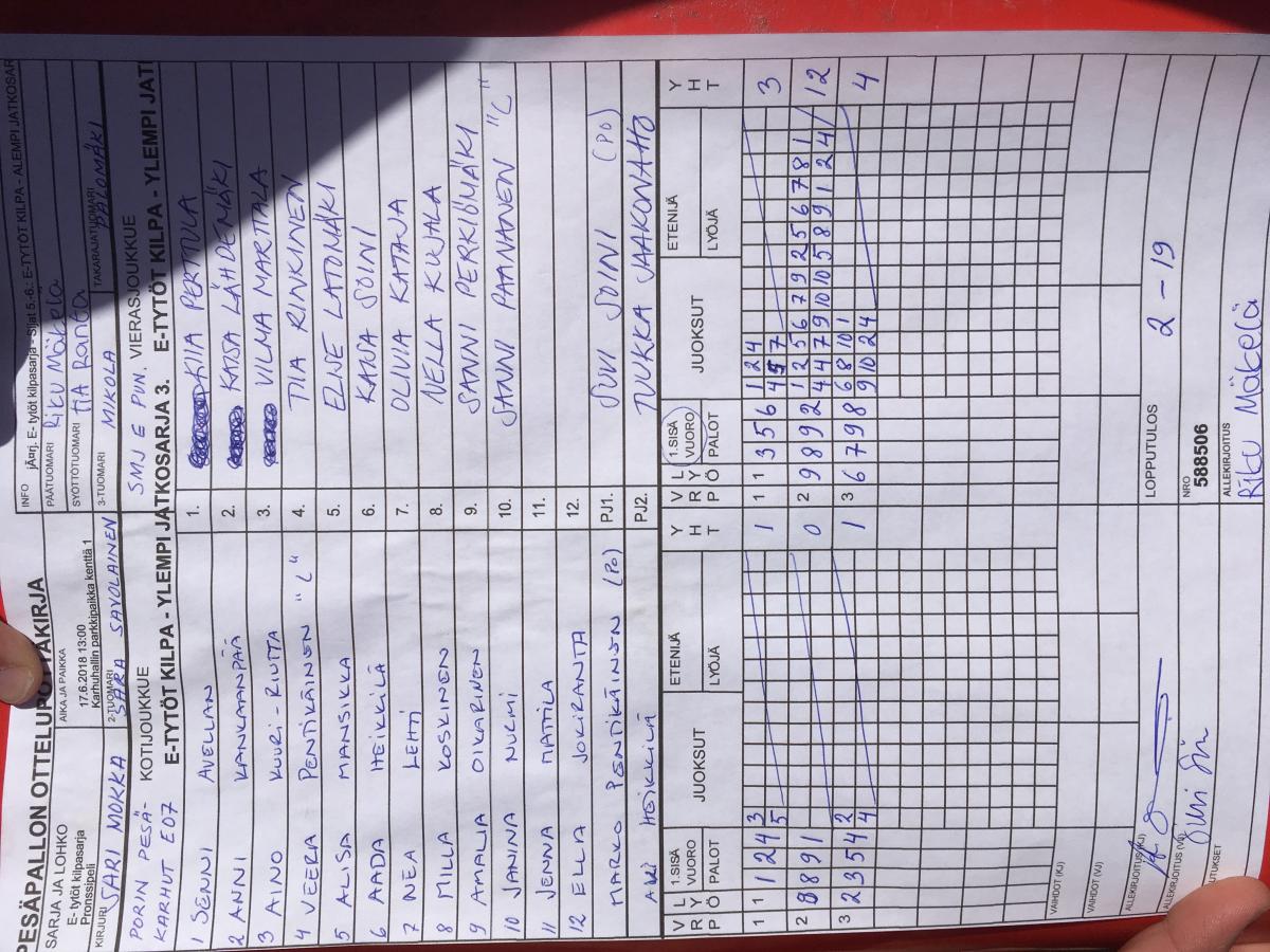 | Finaali | 17.6.2018 14:00 | Karhuhallin parkkipaikka kenttä 1 | Fera E1 | Pesäkarhut E06 | Pesäkarhut E-07 |