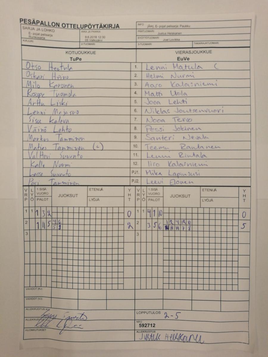 | E- pojat pelisarja - Runkosarja | 9.6.2018 13:30 | 05 Valkojärvi | Paukku | Espoo | TuPe |