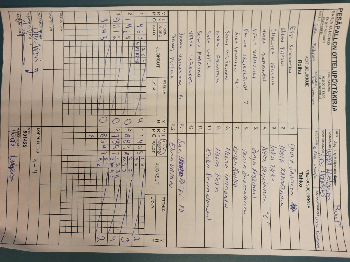 | D- tytöt kilpasarja - Runkosarja | 9.6.2018 18:30 | 03 Tuunankenttä | LaJy | RuoPi | Roihu |
