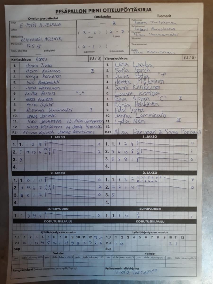 | 17.5.2018 | | Roihu E-tytöt | Espoon pesis E-tytöt White | 1-2 (2-1, 2-7, 0-1) | näytä |