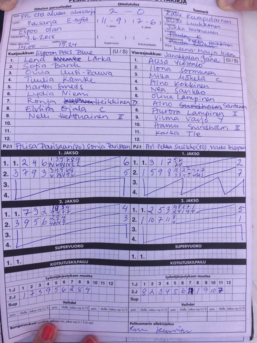 | 3.6.2018 | | Espoon pesis E-tytöt Blue | Janakkalan Jana E-tytöt | 2-0 (11-7, 7-6) | näytä |
