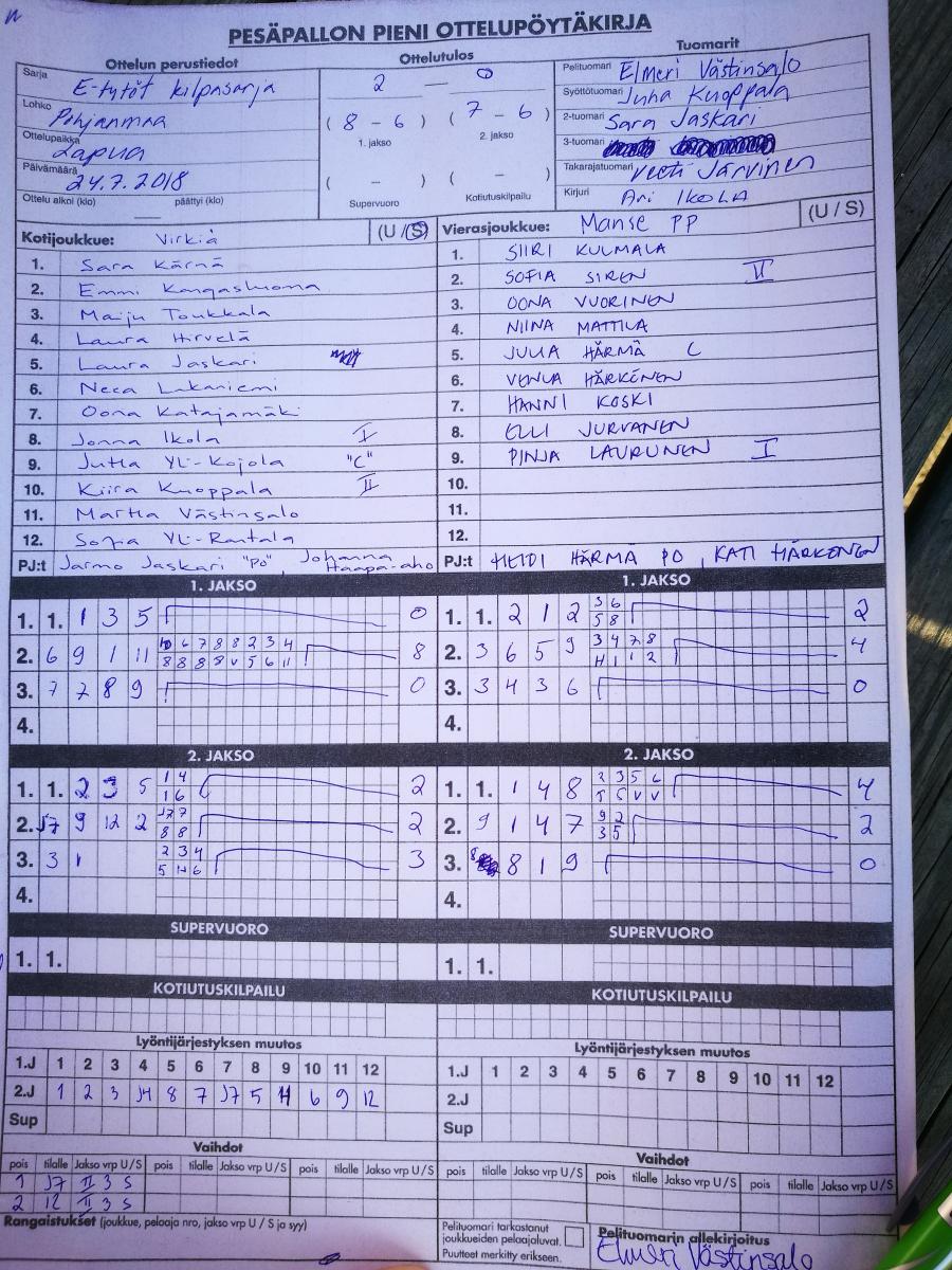 | 16.7.2018 18:00 | Manse PP -06 | Virkiä valkoinen | 1-2 (20-7, 2-14, 0-2) | näytä | |
