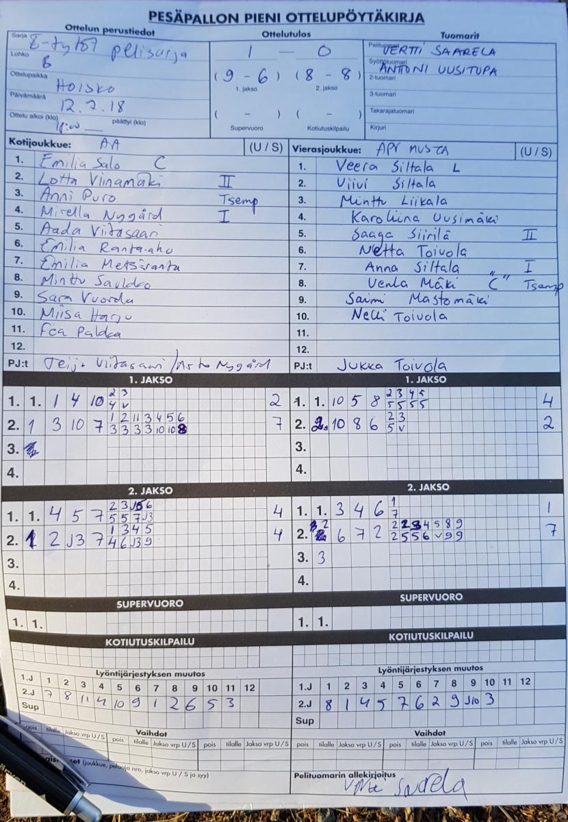 | 4.7.2018 18:00 | APV musta | AA | 2-0 (9-5, 7-6) | näytä | |