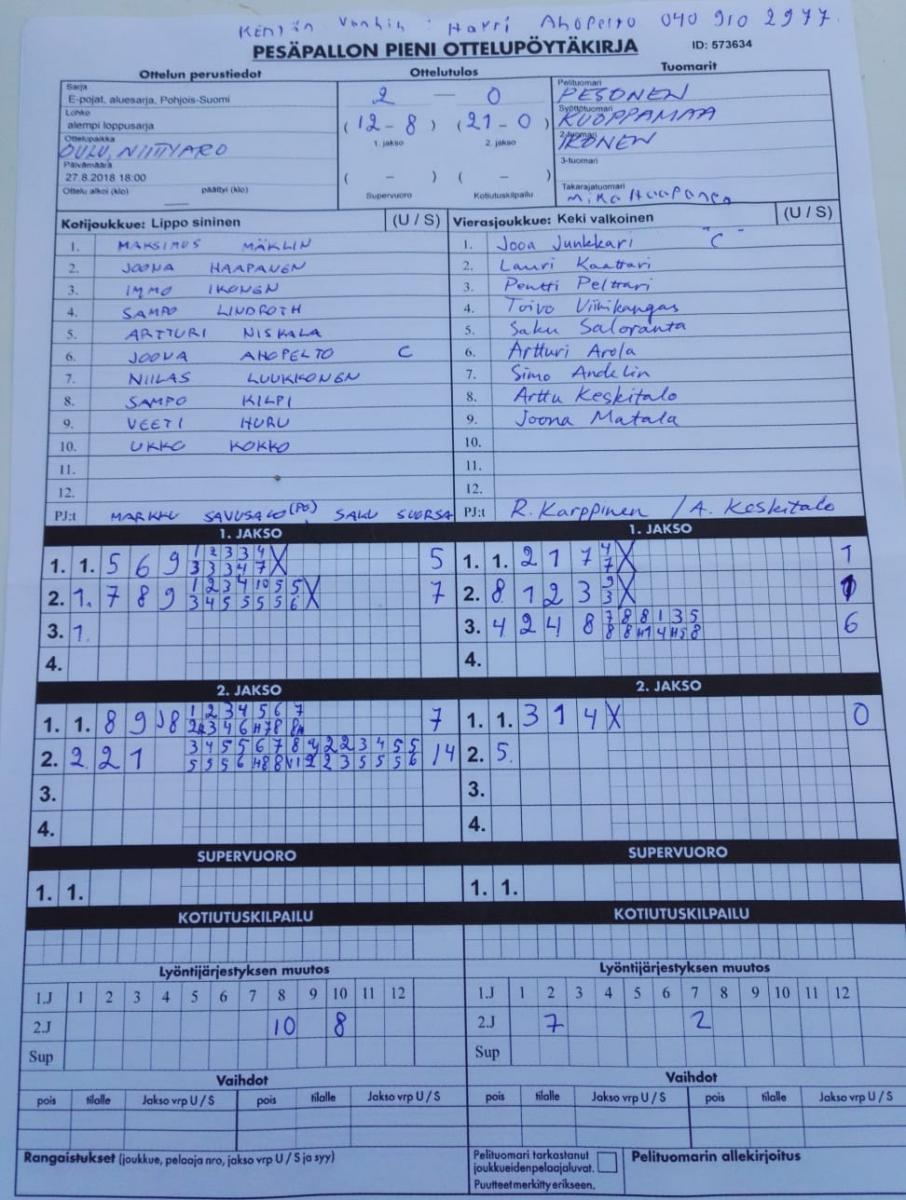 | 27.8.2018 | Lippo sininen | Keki valkoinen | 2-0 (12-8, 21-0) | näytä |