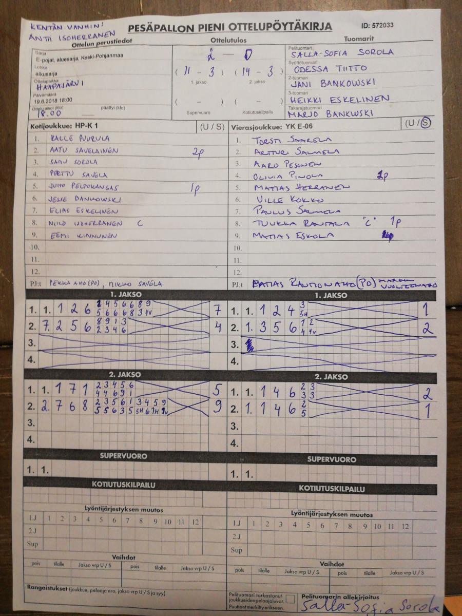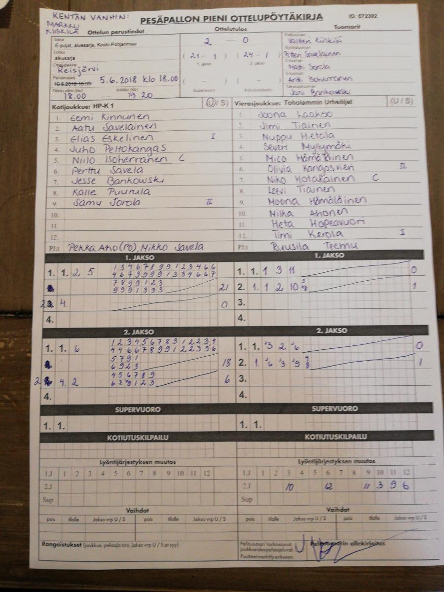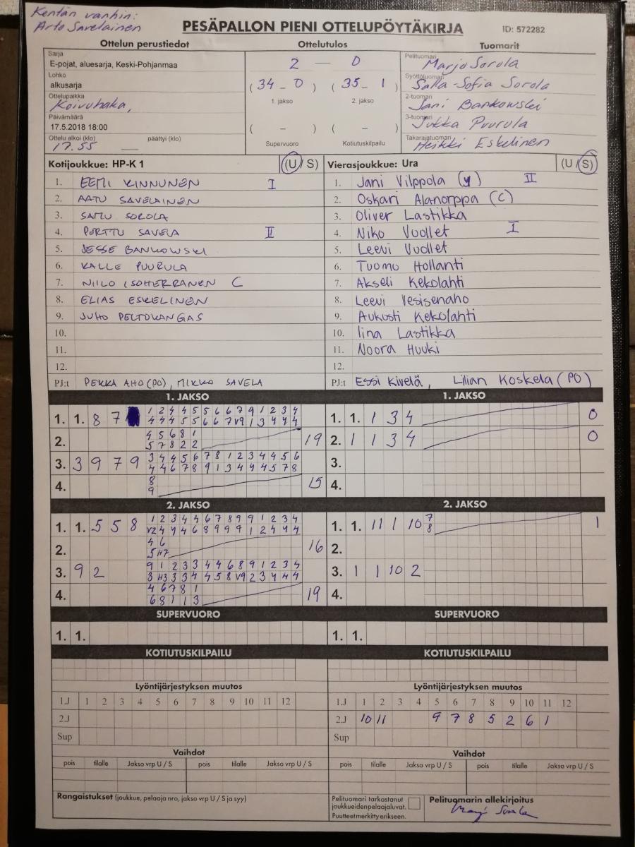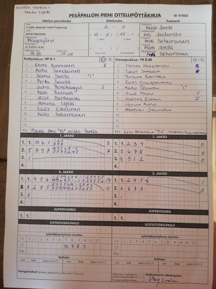 | 25.8.2018 | HP-K 1 | Halsua E-pojat | 2-0 (11-0, 6-4) | ||
