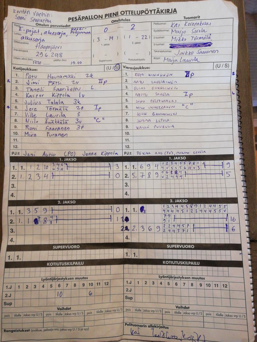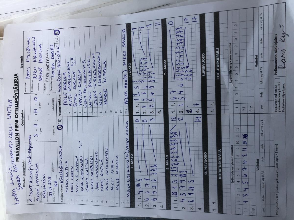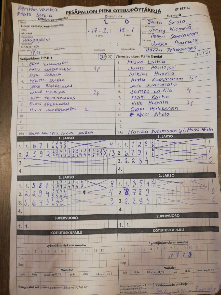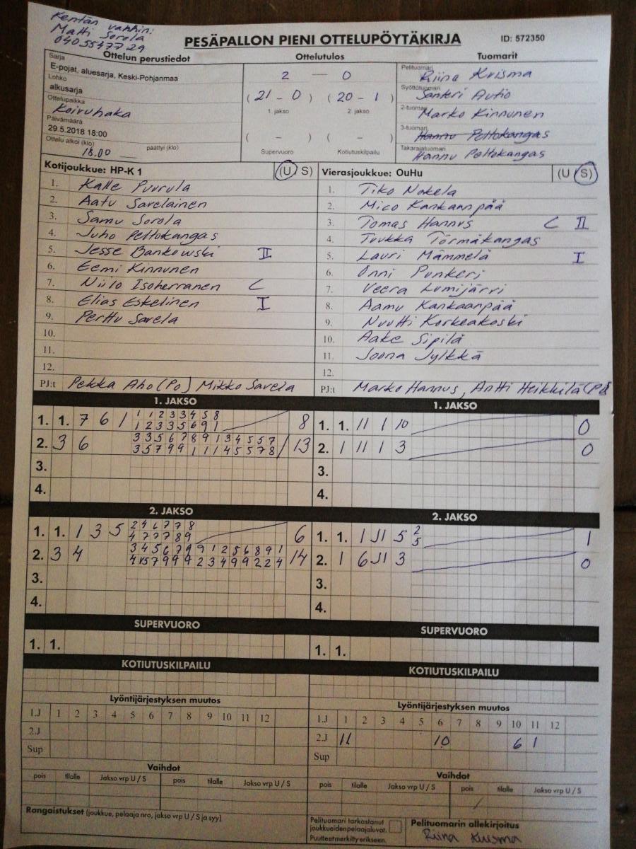| 25.8.2018 | HP-K 1 | Halsua E-pojat | 2-0 (11-0, 6-4) | ||