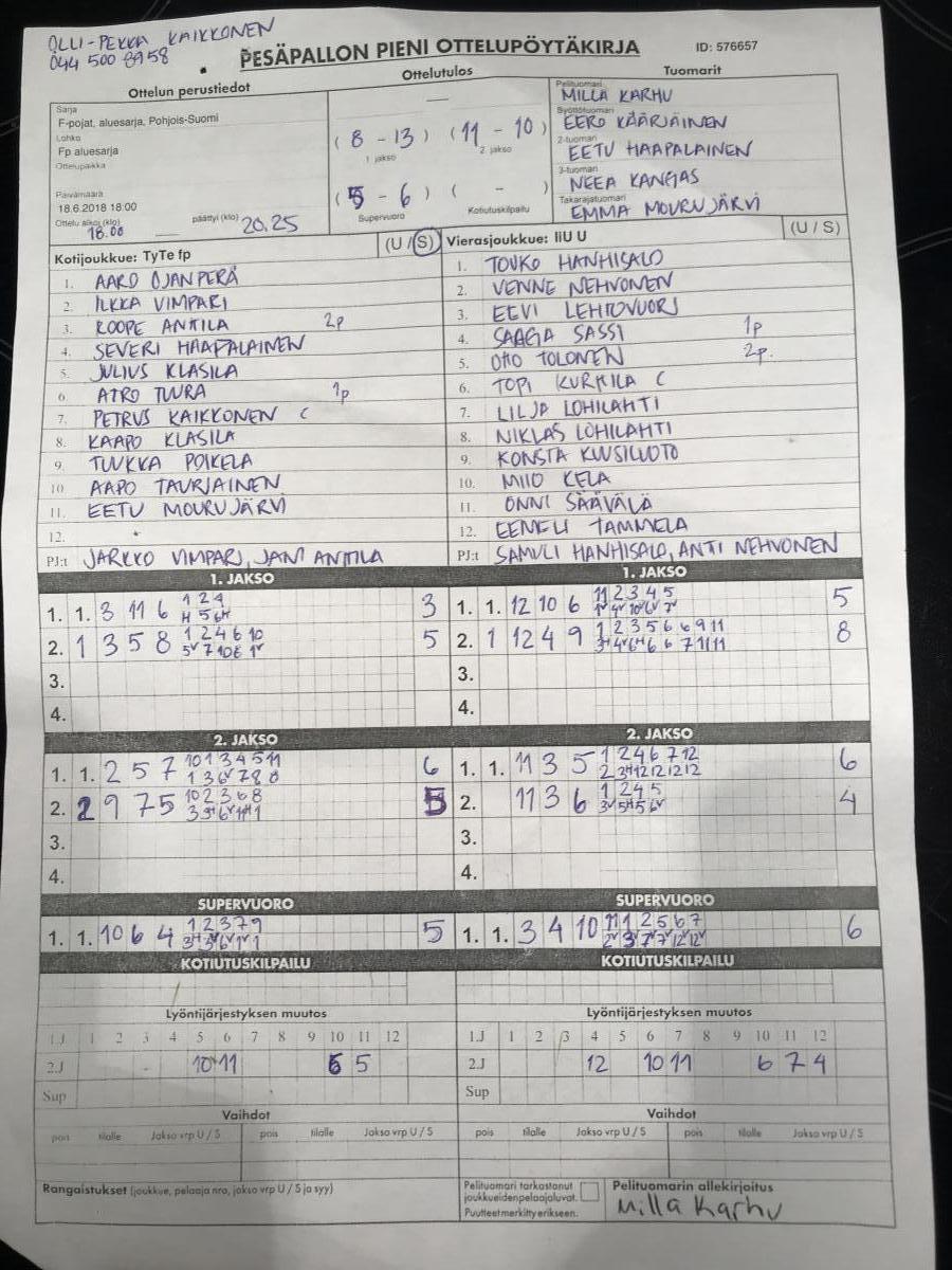 | 18.6.2018 | TyTe fp | IiU U | 1-2 (8-13, 11-10, 5-6) | näytä | |