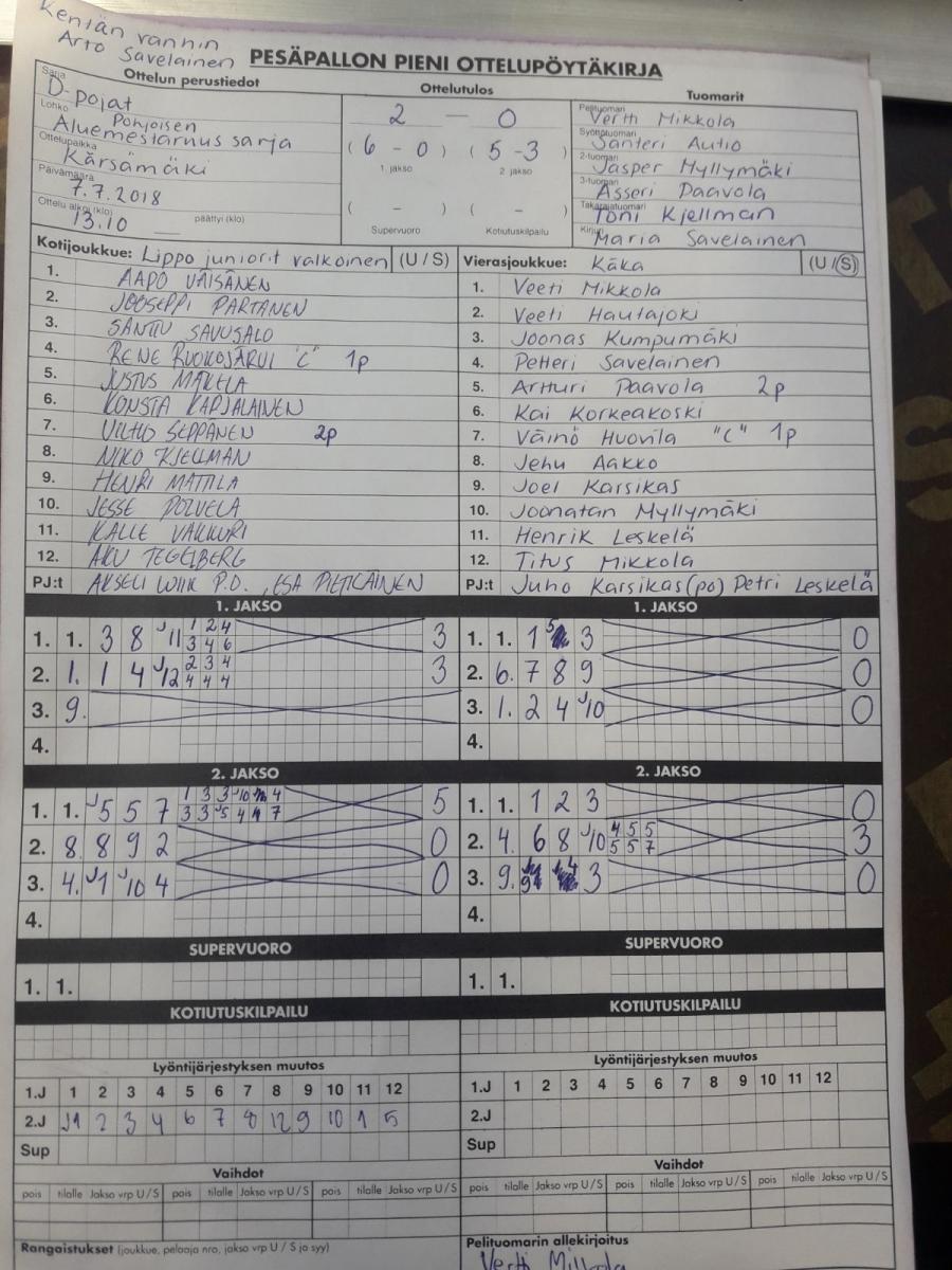 | 7.7.2018 | Lippo Juniorit Valkoinen | KäKa | 2-0 (6-0, 5-3) | näytä | |