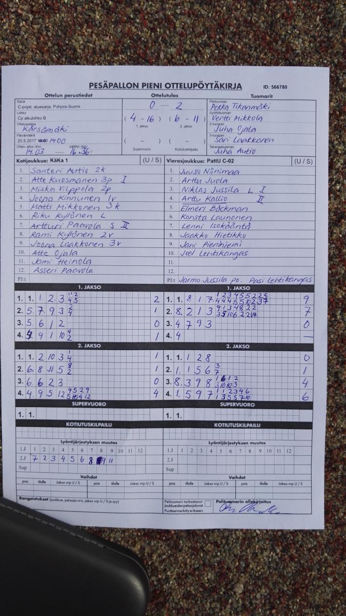 | 20.5.2017 | KäKa 1 | PattU C-02 | 0-2 (4-16, 6-11) | näytä | |