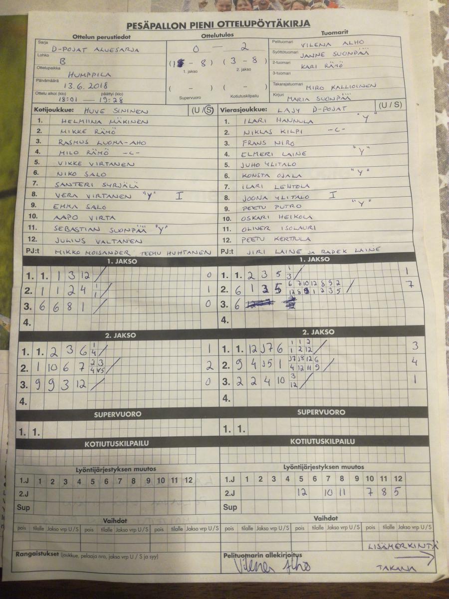 | 13.6.2018 | HuVe sininen | LaJy D-pojat | 0-2 (1-8, 3-8) | näytä | |