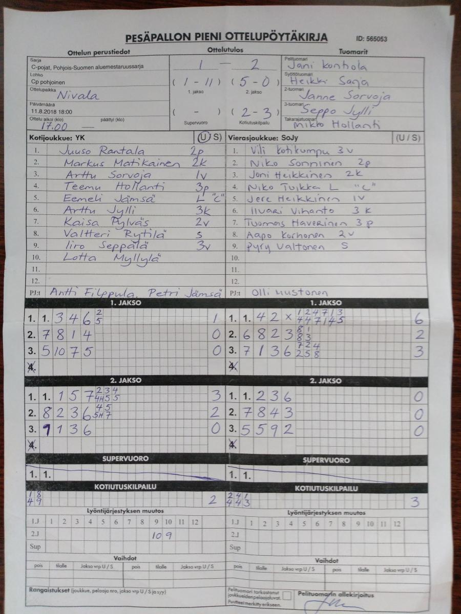 | 11.8.2018 | YK | SoJy | 1-2 (1-11, 5-0, 0-0, 2-3) | näytä |