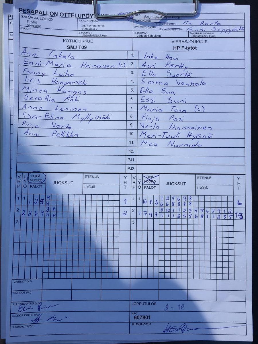 | F- tytöt - Alkusarjat | 25.7.2018 13:00 | Kumiseva | PattU Pinkit | HP-K | SMJ T09 |