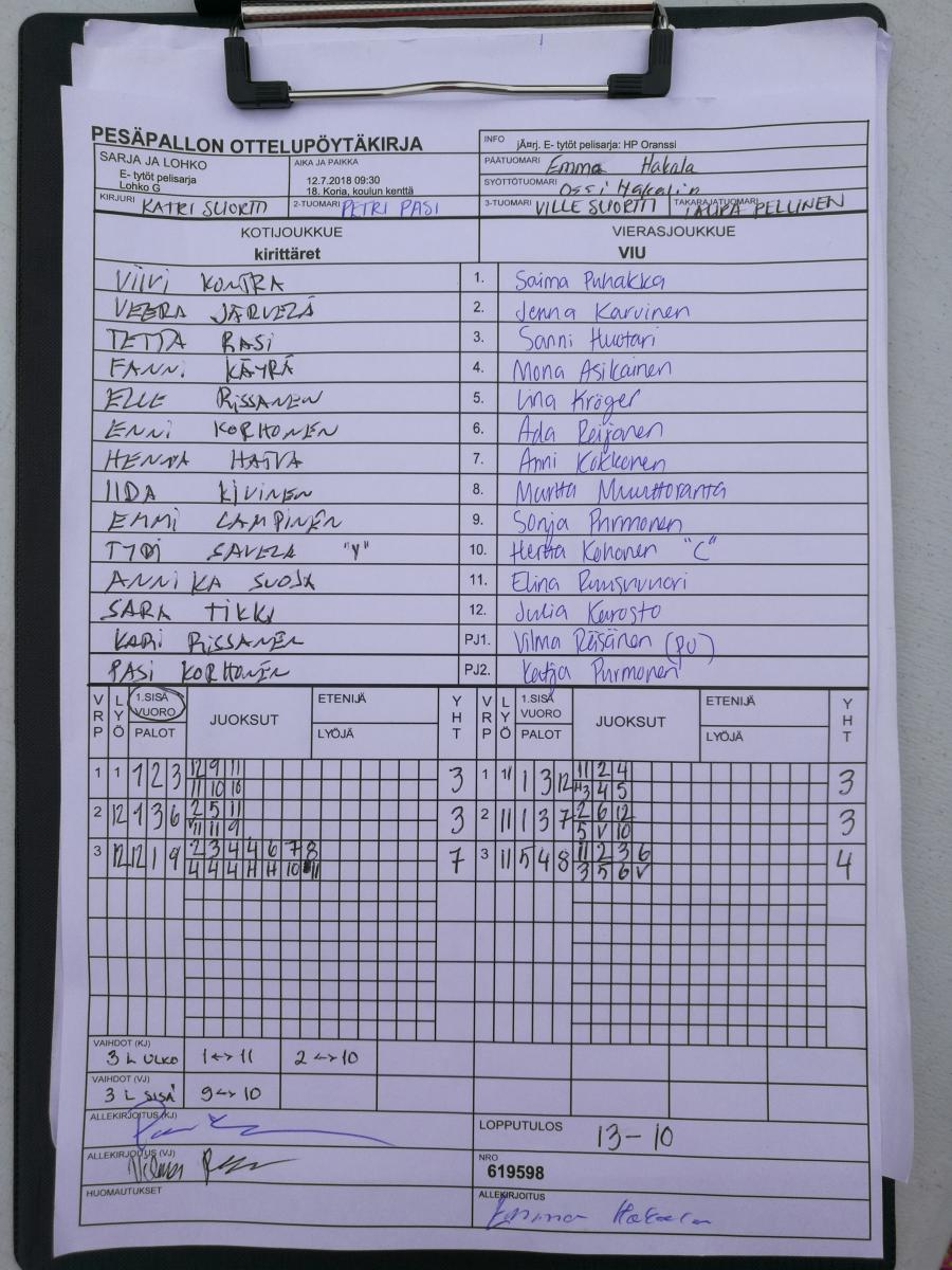 | E- tytöt pelisarja - Lohko D | 9.7.2018 20:00 | 15. Kuusankoski, PP- Stadion | SMJ punainen | Manse E07T | VIU |