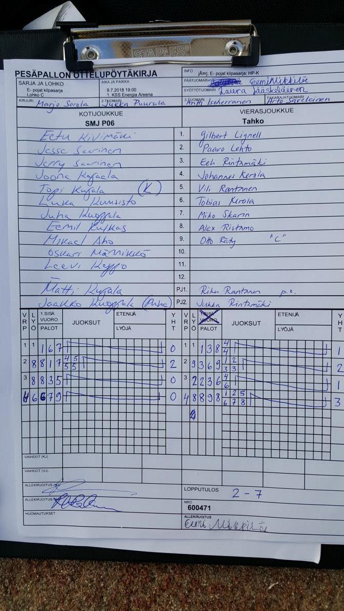 | Lohko E | 10.7.2018 18:00 | 1. KSS Energia Areena | Lippojuniorit valkoinen | JoMa06 | Tahko |