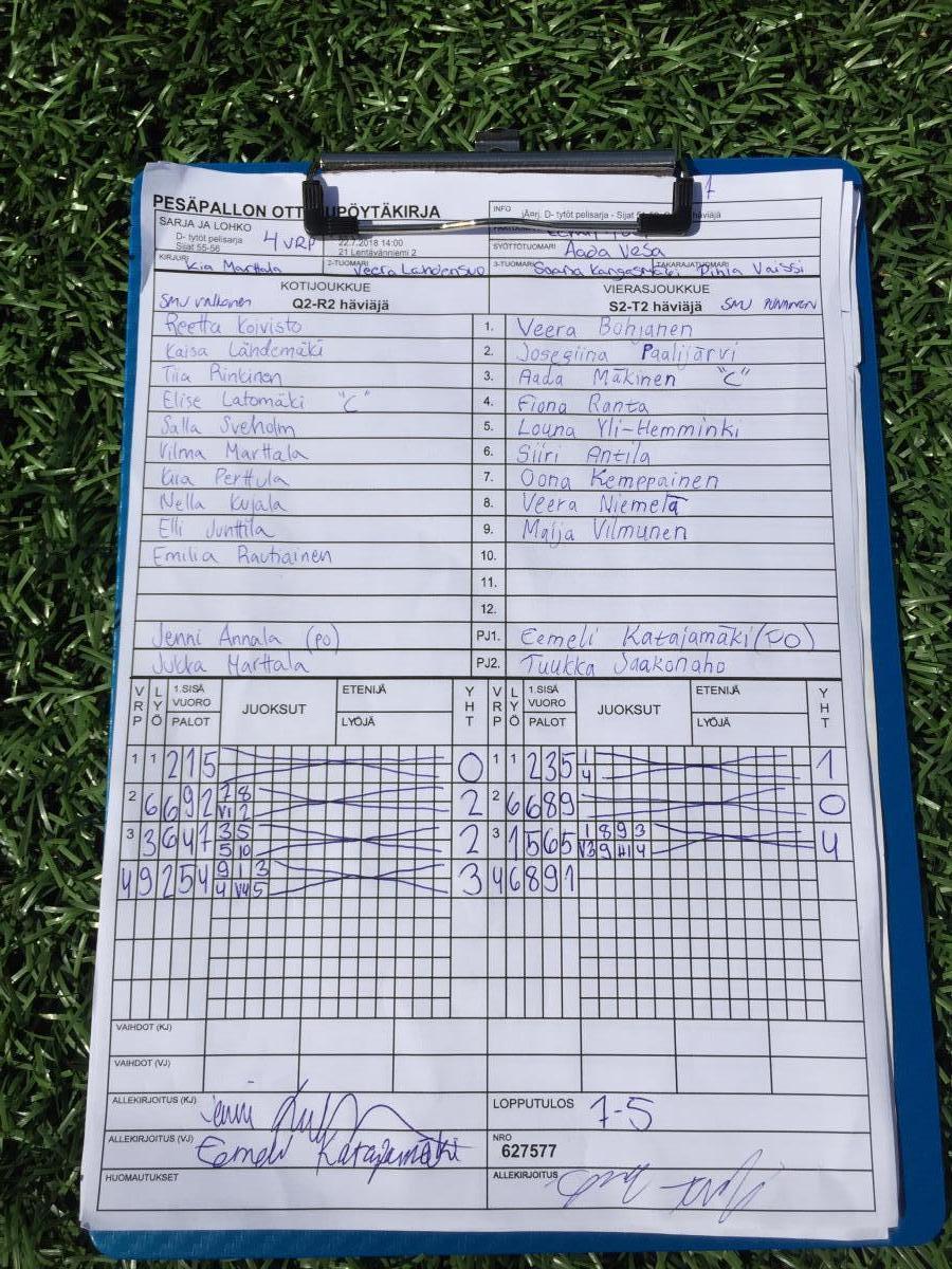 | 22.7.2018 14:00 | 21 Lentävänniemi 2 | SMJ Valkoinen | SMJ punainen | 7-5 | näytä |