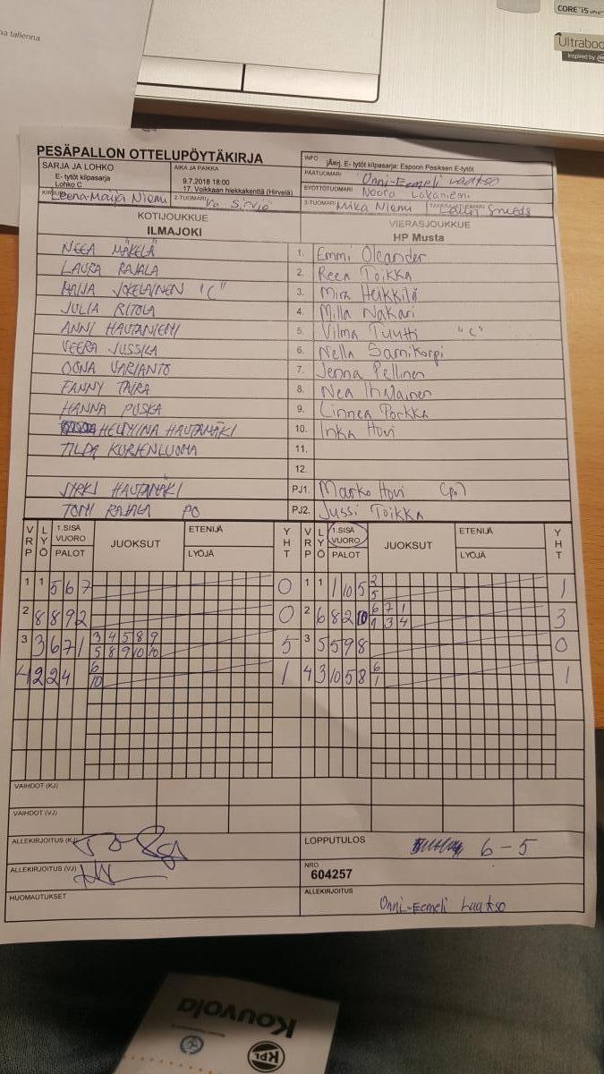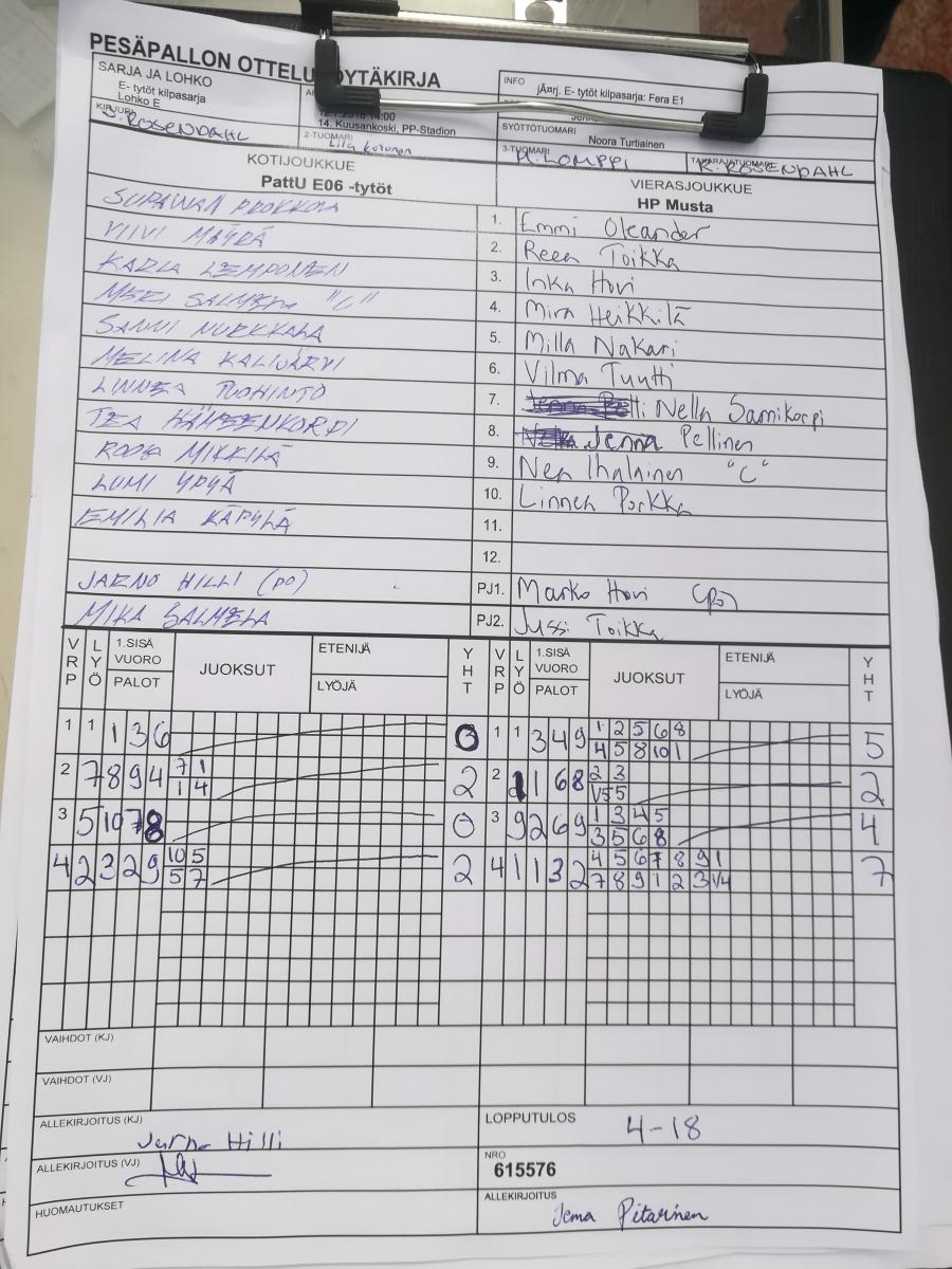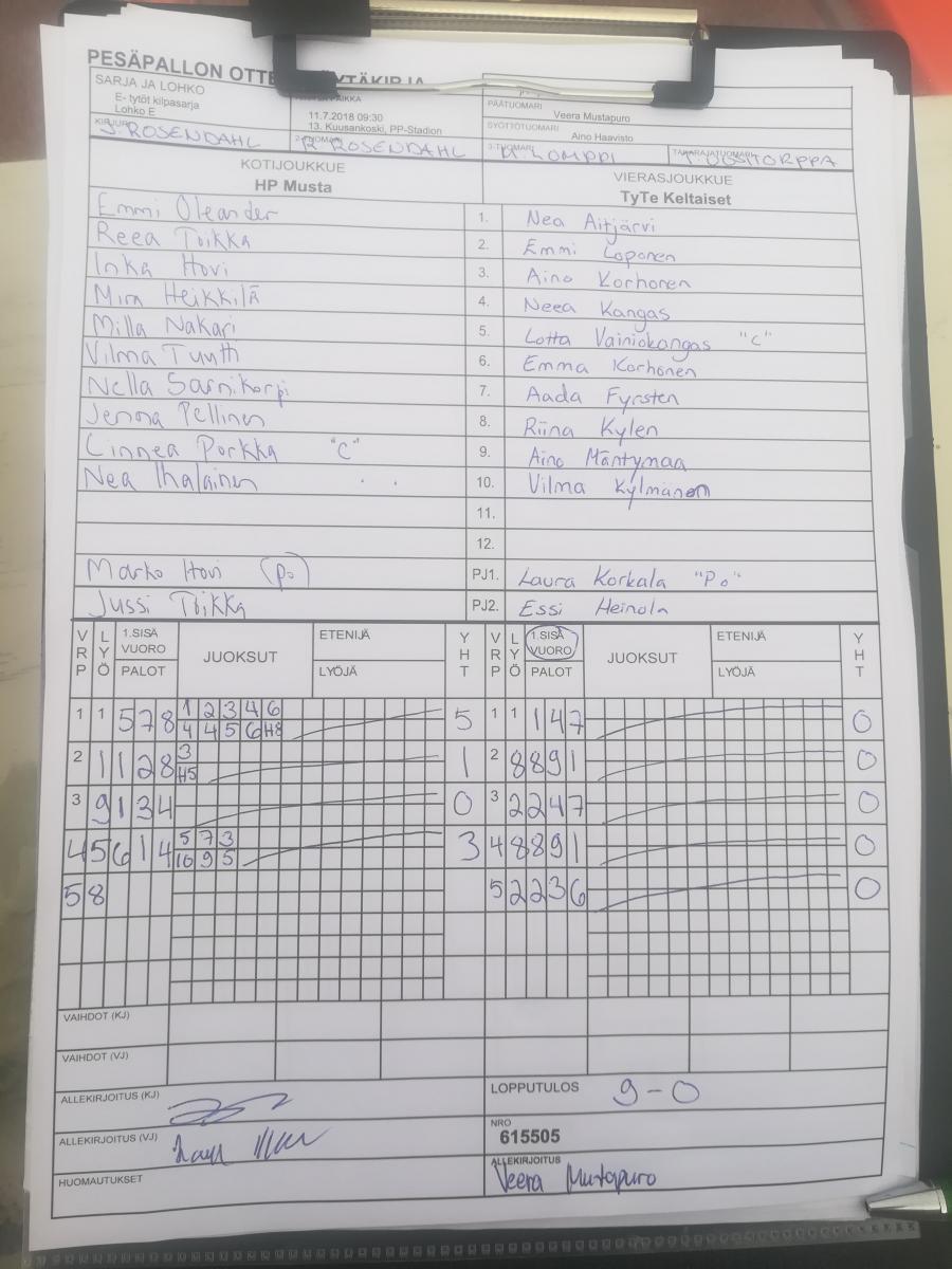 | E- tytöt kilpasarja - Lohko A | 8.7.2018 14:30 | 13. Kuusankoski, PP-Stadion | TyTe Keltaiset | Espoon Pesiksen E-tytöt | HP Musta |