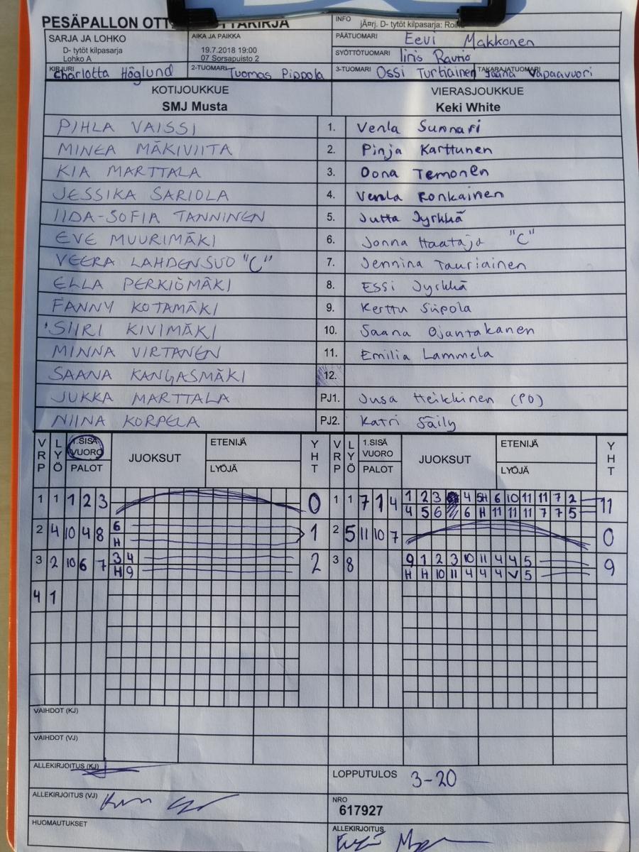 | D- tytöt kilpasarja - Lohko A | 17.7.2018 14:30 | 16 Tahmela | Pesäkarhut punaiset | Roihu | SMJ Musta |