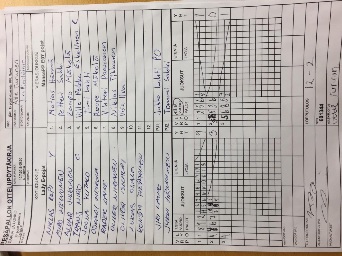 | E- pojat kilpasarja - Lohko G | 10.7.2018 18:00 | 6. Sarkola | HP | Manse E06 | MansePP E07 pojat |