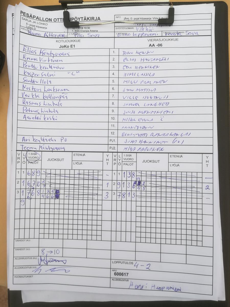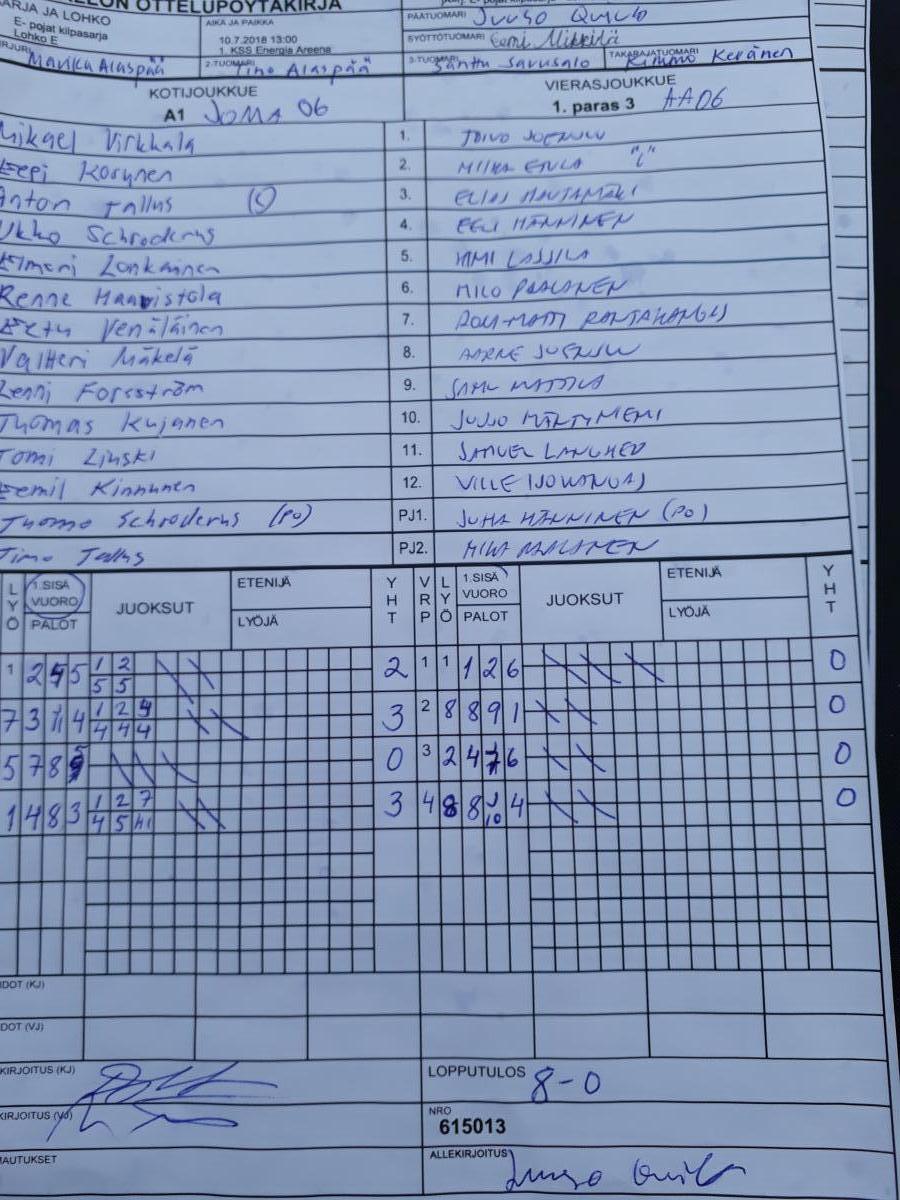| Lohko E | 10.7.2018 14:00 | 1. KSS Energia Areena | SoJy | Lippojuniorit valkoinen | AA -06 |