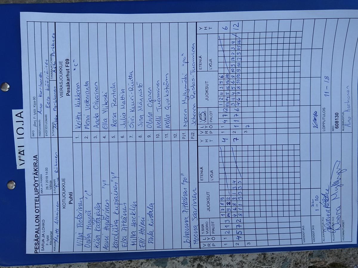 | F- tytöt - Alkusarjat | 26.7.2018 13:00 | Välioja | Pesäkarhut F-08 | Kipa-90 | Pesäkarhut F09 |