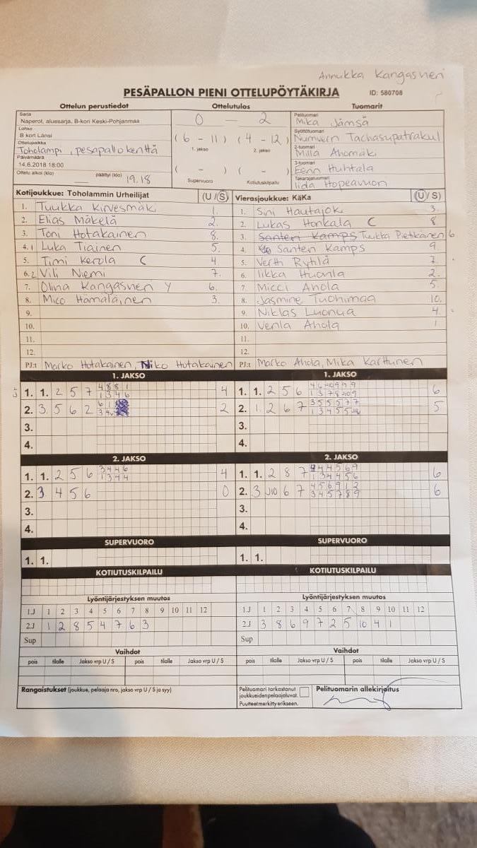 | 14.6.2018 | Toholammin Urheilijat | KäKa | 0-2 (6-11, 4-12) | näytä | |