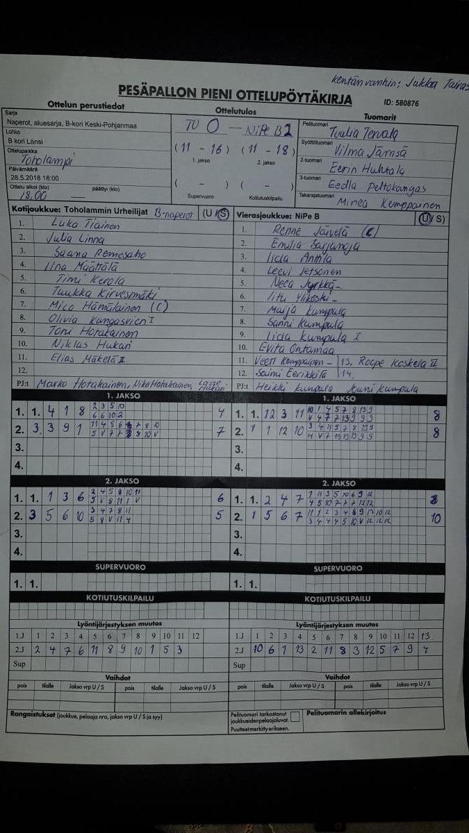 | 28.5.2018 | Toholammin Urheilijat | NiPe B | 0-2 (11-16, 11-18) | näytä | |