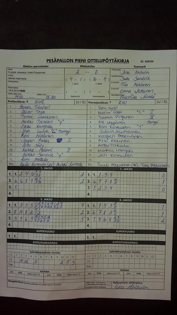 | 18.8.2018 | NiPe | Kinnula | 2-0 (4-1, 16-4) | näytä | |