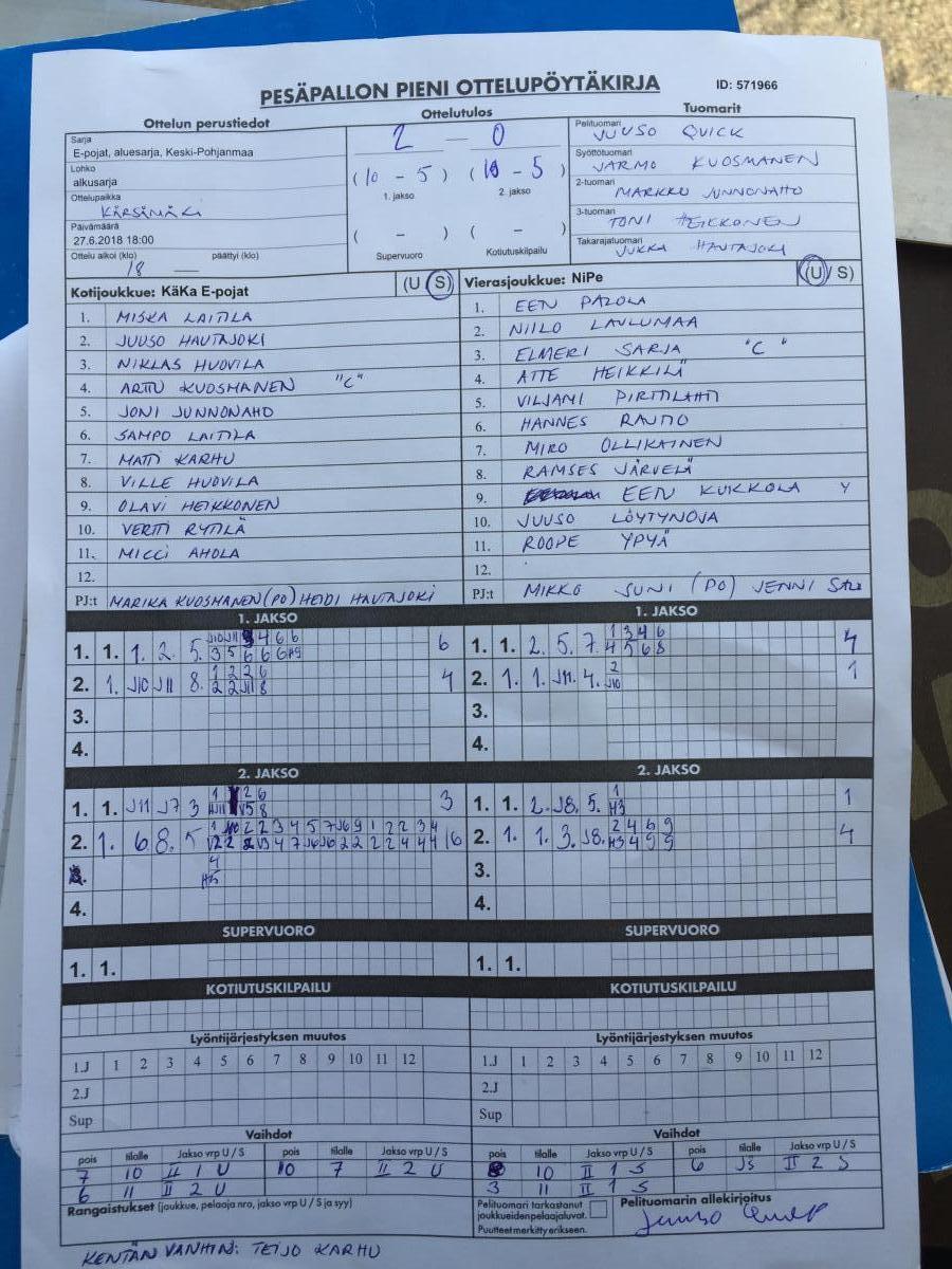 | 27.6.2018 | KäKa E-pojat | NiPe | 2-0 (10-5, 19-5) | näytä | |