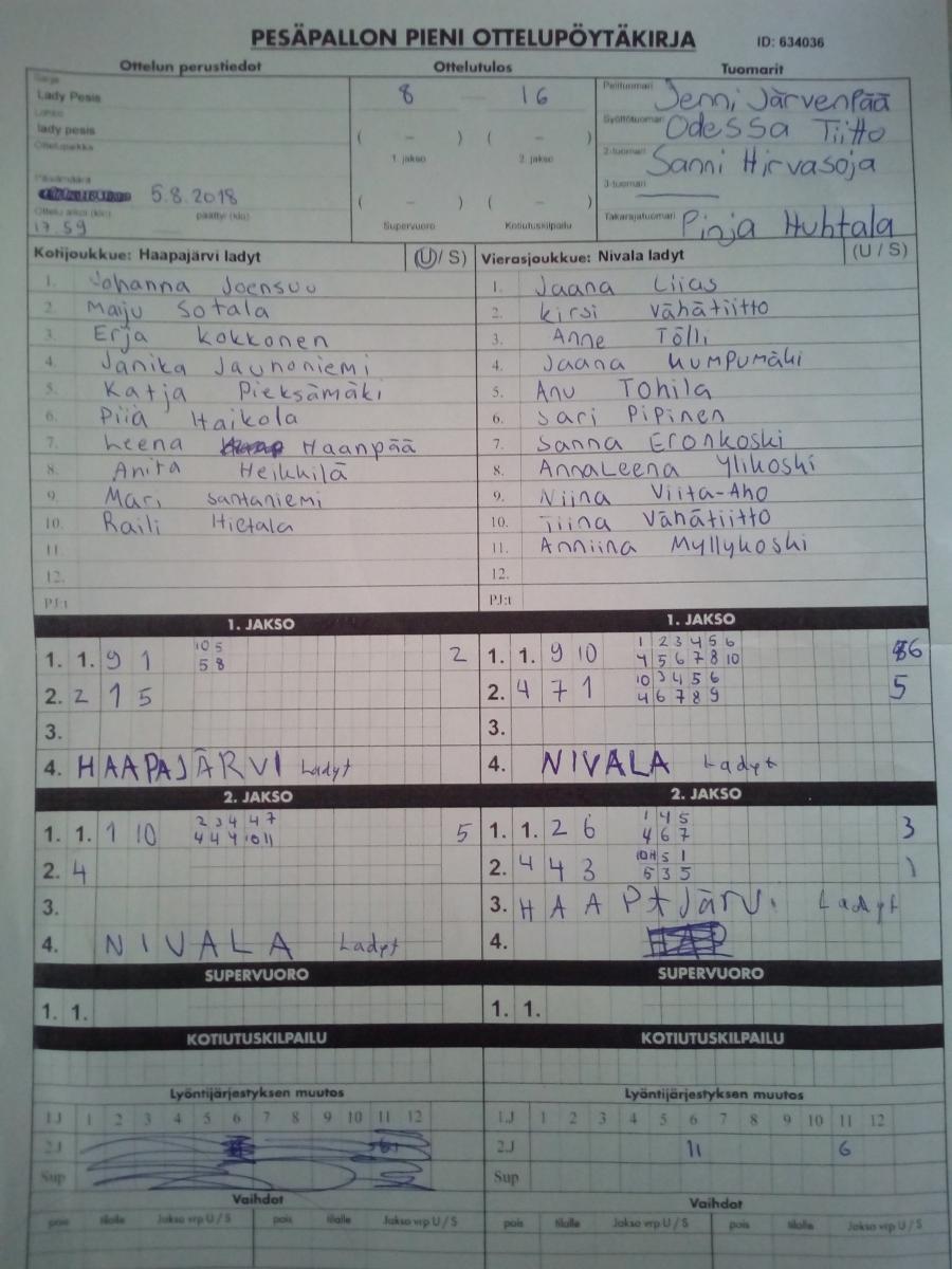 | 14.7.2018 | Haapajärvi ladyt | Nivala ladyt | 0-1 (8-16, 0-0) | näytä | |