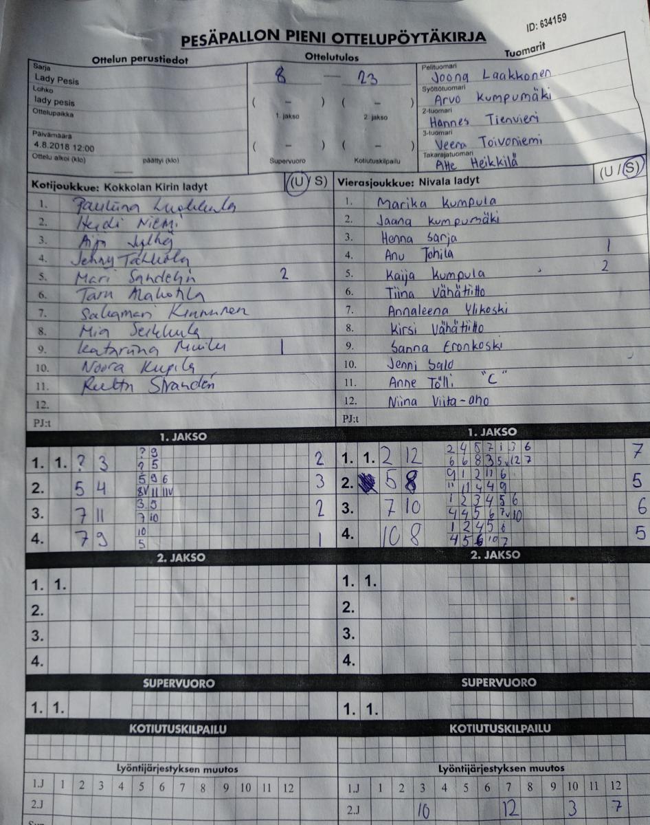 | 29.6.2018 | Nivala ladyt | Kokkolan Kirin ladyt | 2-0 (12-5, 15-6) | näytä | |