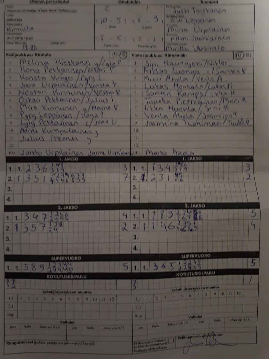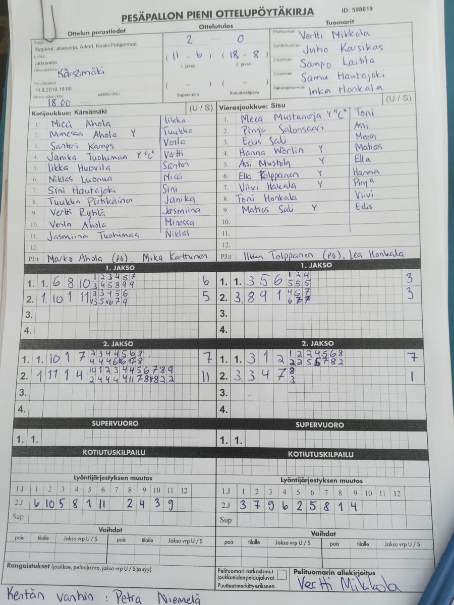 | 31.7.2018 | Kinnula | Kärsämäki | 2-1 (10-5, 6-9, 5-5, 2-1) | näytä | |