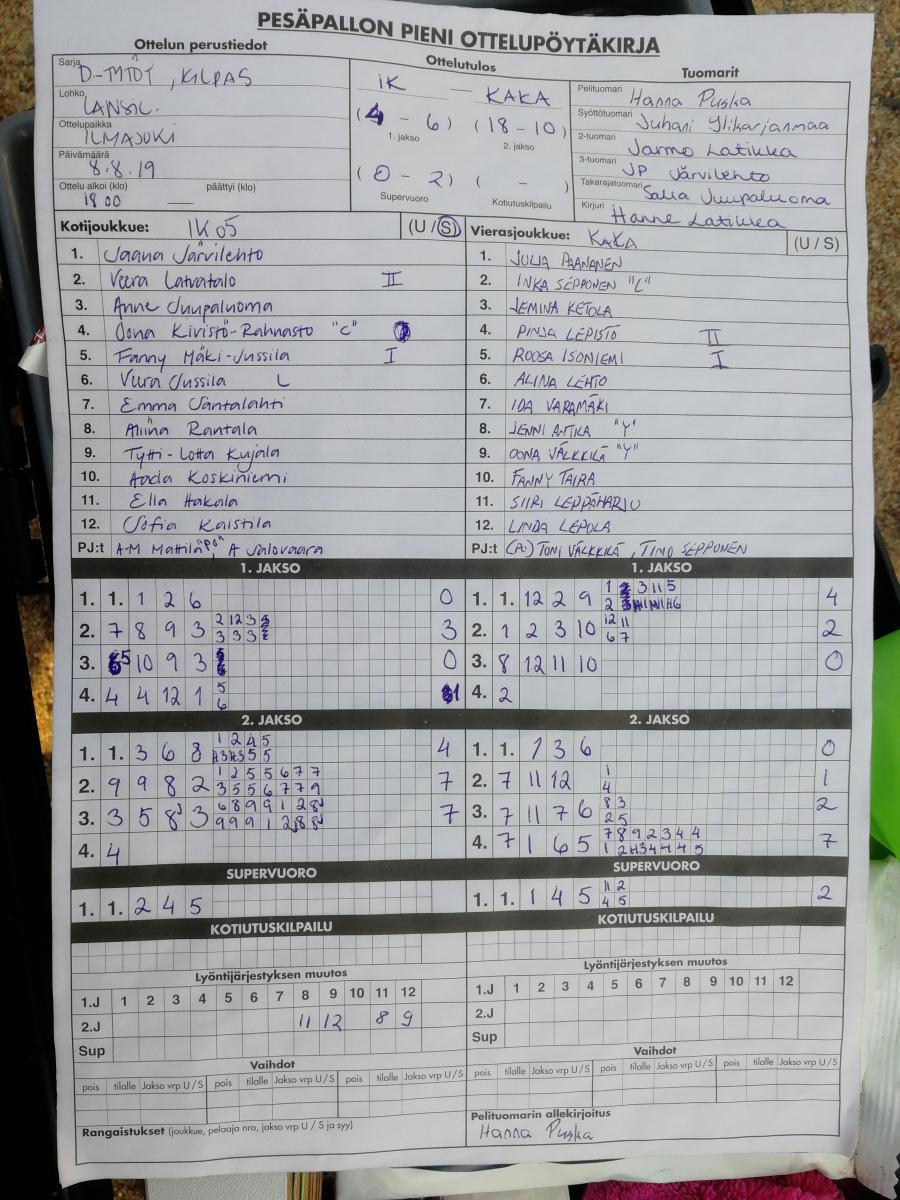 | 29.7.2019 16:00 | Pesäkarhut D-mustat | Kaka | 2-0 (9-7, 23-3) | näytä | |