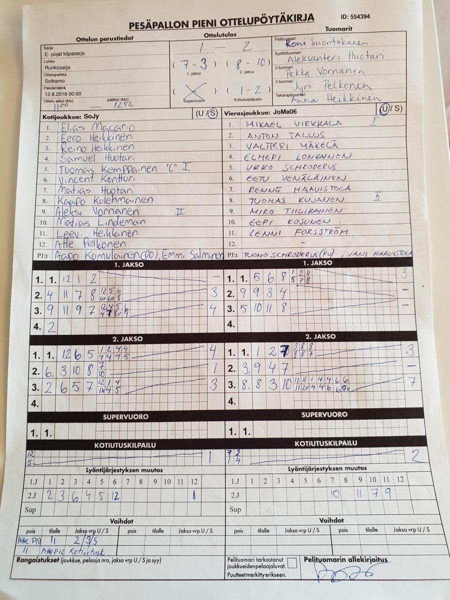 | 18.8.2018 00:04 | E- pojat kilpasarja | Runkosarja | SoJy | JoMa07 | 2-0 (11-5, 10-1) | | näytä |
