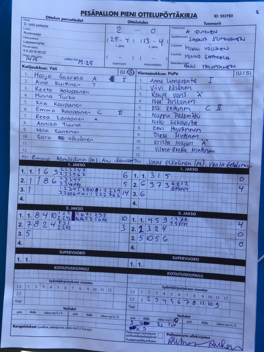 | 5.8.2018 00:04 | D- tytöt pelisarja | Runkosarja | PuPe | Kirittäret | 0-2 (8-15, 5-10) | | näytä |